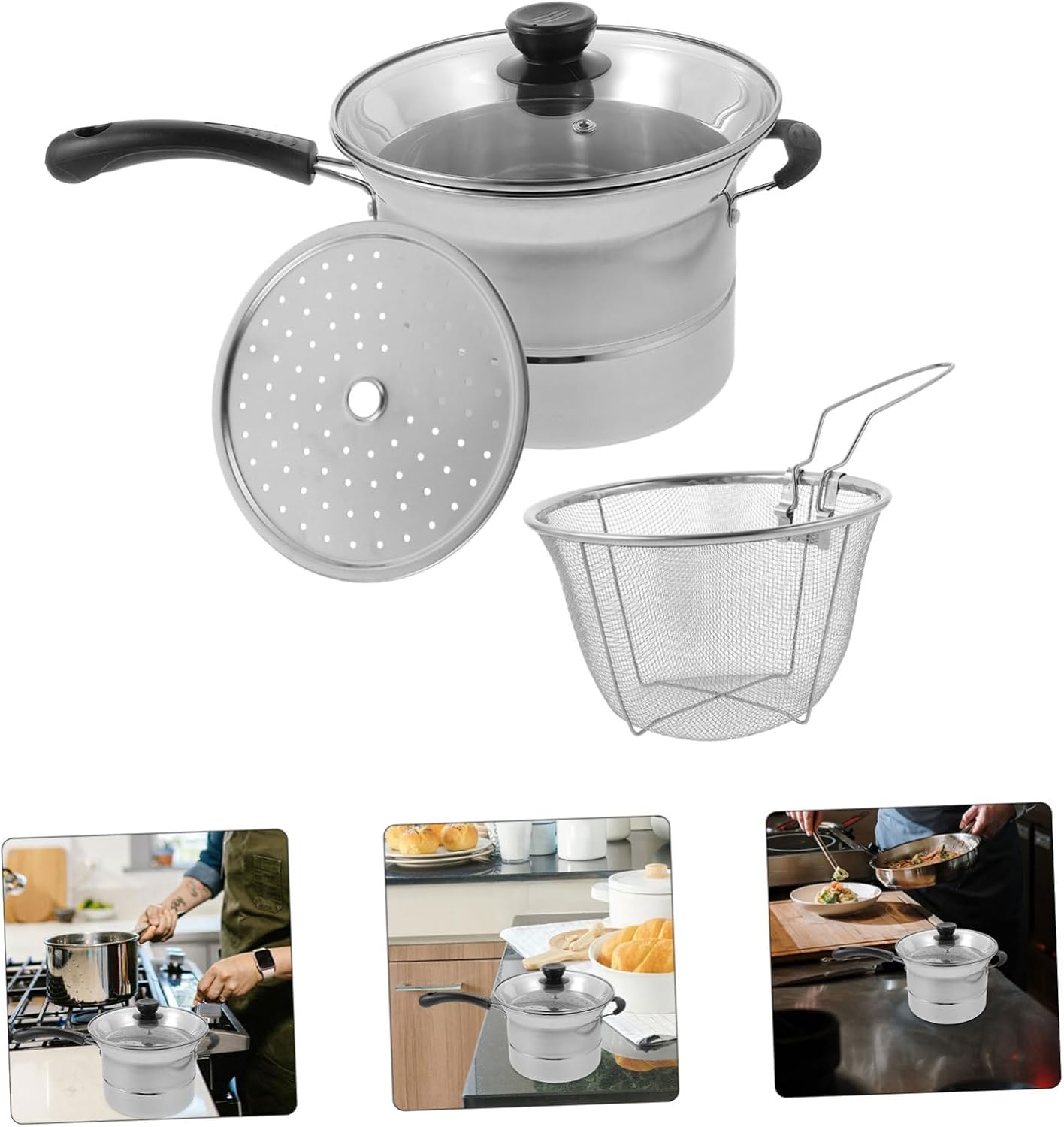 Package Include 1 x pot 1 x plate 1 x mesh sieve Features - Note: Random handle style fryer pot - Material: Stainless steel pasta strainer - Pot Size: 22.00X22.00X20.00cm/8.65X8.65X7.86in noodle pot - Color: Silver spaghetti pot with strainer - Handle Size: 17.00X3.00X2.50cm/6.68X1.18X0.98in frying boiling pot - Owning the and break resistance ability, very practical, with excellent texture spaghetti pan with basket. - The handle for easier and more convenient to move. The design is smooth and hurt the hand for safe using frying basket pot. - Heat is distributed evenly for quick cooking of soups, milk, convenient and useful for you, small size and portable. stainless steel fryer pot - Non-stick and smooth surface, easy to clean and handle. The single handle can prevent burns multipurpose deep frying pot. - After frying, simply lift the fryer basket and move directly from the pan to the plate, easy to use pasta pot.Goods Descriptionpasta pot It is designed for cooking foods like soup, oatmeal etc.spaghetti pot with strainer Smooth surface with simple design, suitable for home and restaurant using.frying boiling pot Are you looking for cooking saucepan? The cooking pot with steaming pot is manufactured of stainless steel material