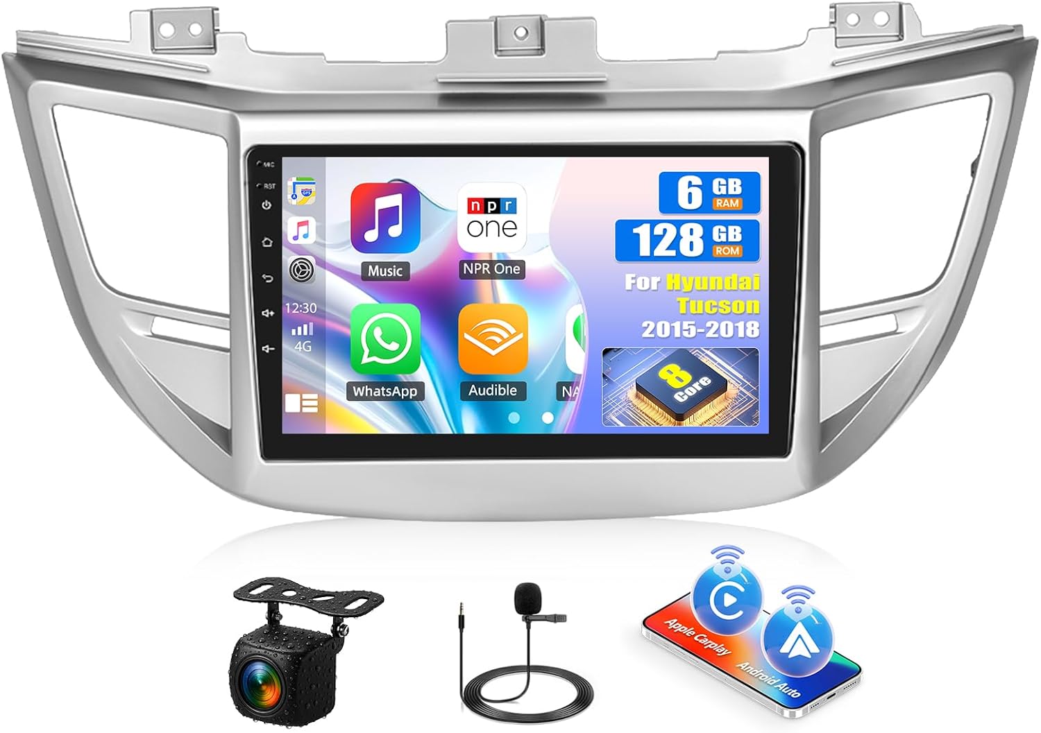 4G+128G for Hyundai Tucson 2015-2018 Android 15 Car Stereo Radio with Wireless CarPlay Android Auto, 9”1280 * 720P IPS Touchscreen, Bluetooth5.0, GPS, WiFi, AHD Rear Camera, DSP, EQ, Split Screen, SWC