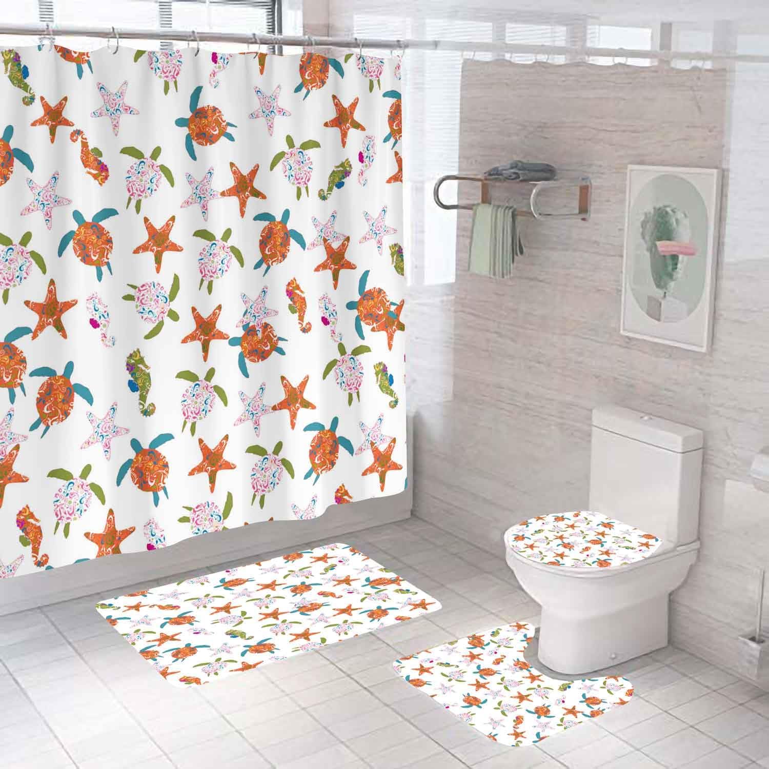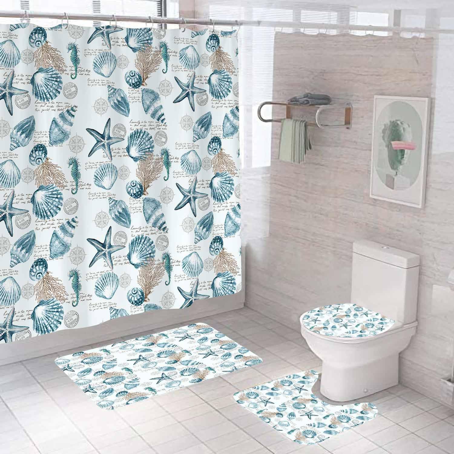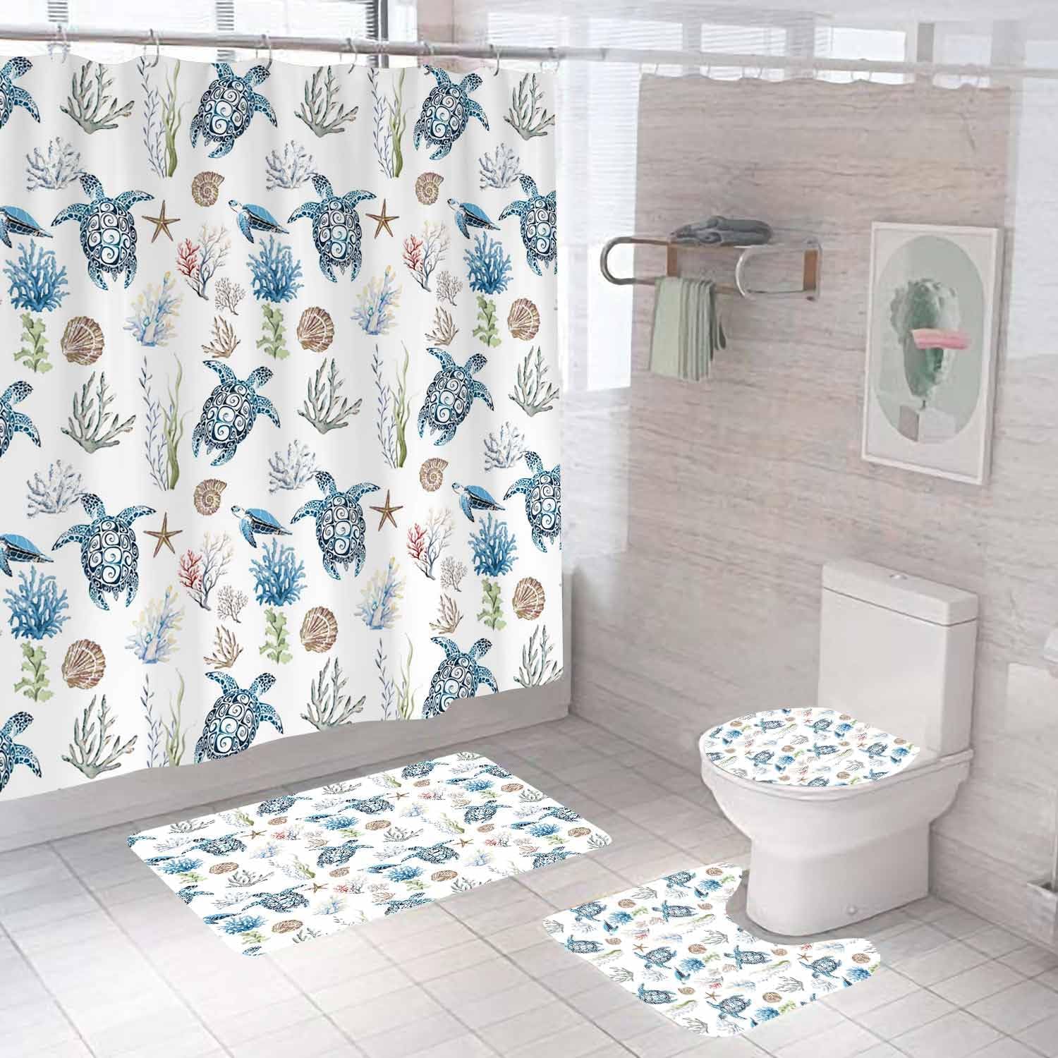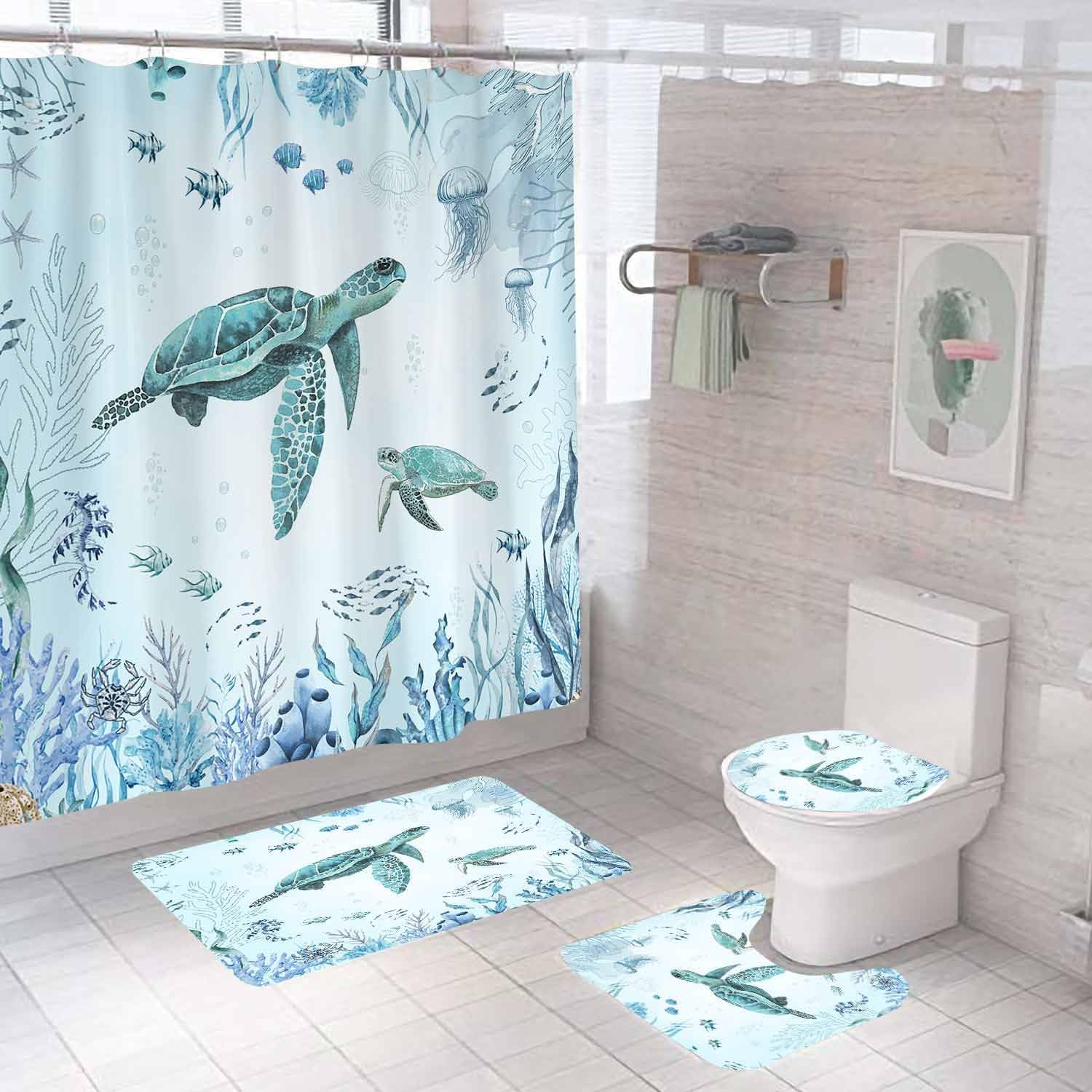 4PCS Blue Sea Turtle Shower Curtain Sets with Rugs, Waterproof Fabric Shower Curtain, Positive Inspirational Quotes Ocean Sea Underwater Starfish Seashell Nautical Coastal Beach Bathroom Decor