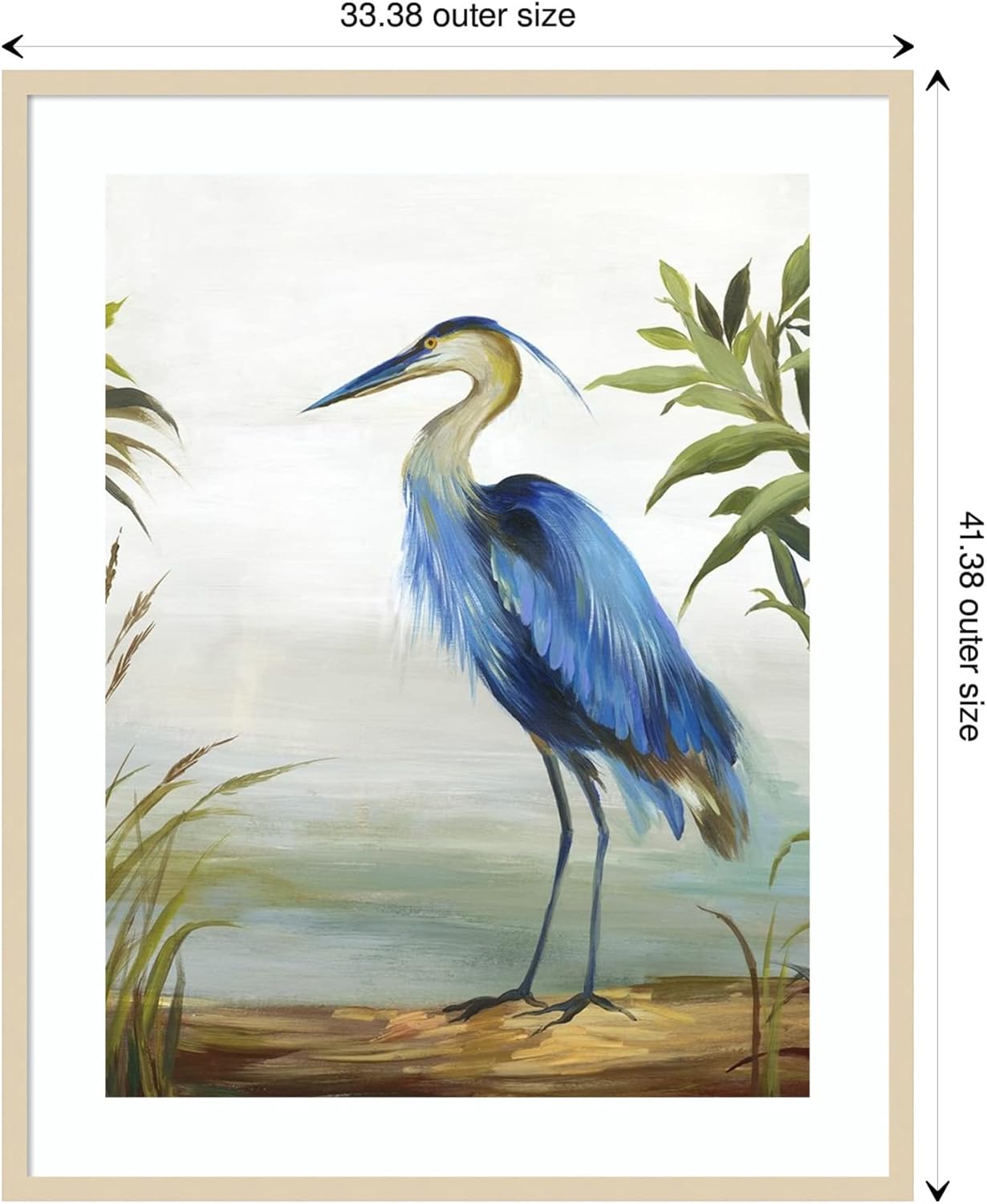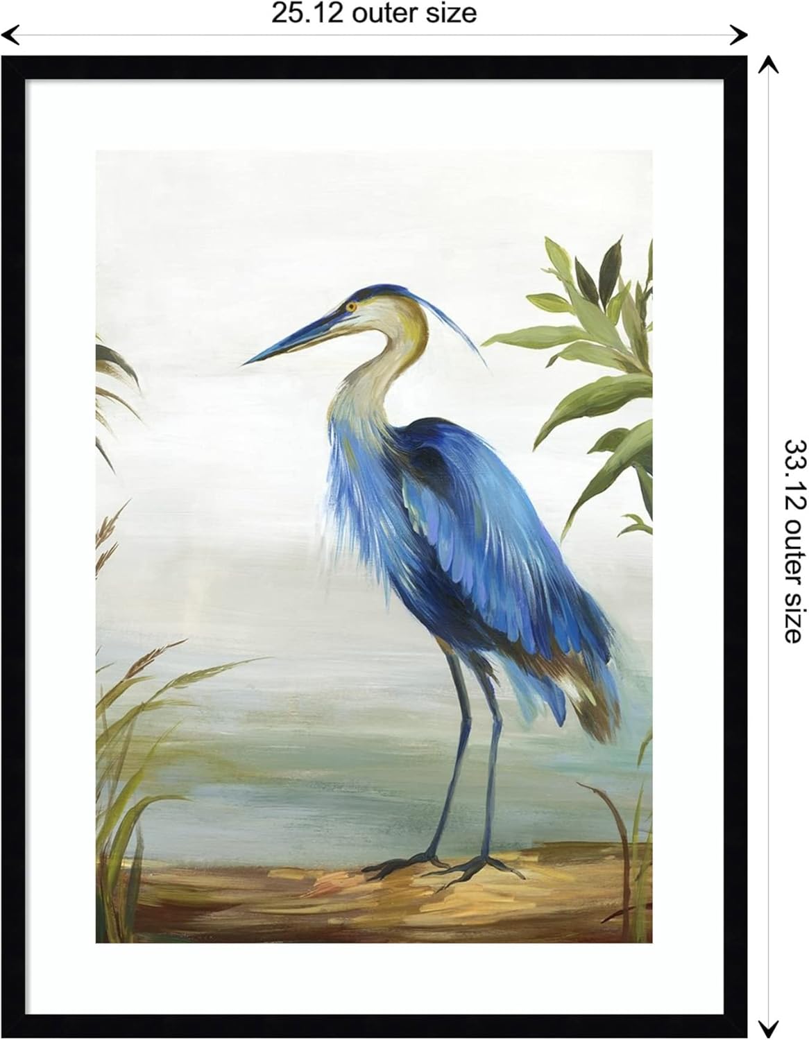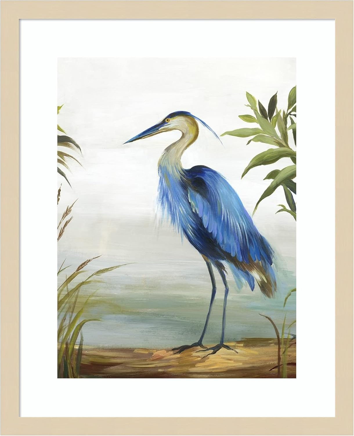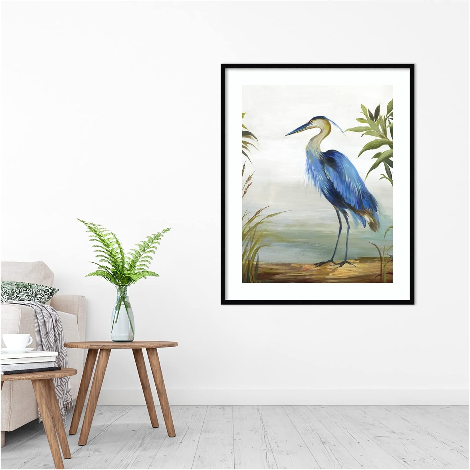 CUSTOM ARTWORK DETAILS: TITLE: Blue Heron; ARTIST: Aimee Wilson. DESCRIPTION: This painting features a majestic blue heron standing in profile on the banks of a body of water. Is he looking at his next meal or his true love? We do not know, but the plants have parted, making a space for him as he decides what to do next.. OUTER SIZE: 18 in. W x 22 in. H. 100% REAL WOOD FRAME DETAILS: The Svelte Noir Black frame features a narrow frame with flat surfaces and a smooth matte black finish. This Amanti Art framed art print was created by Aimee Wilson and printed by Amanti Art in Madison WI. The print is giclee printed using fade-resistant inks for picture-perfect detail and incredible depth of color and finished with a 100% real wood frame. Individually made using traditional custom framing techniques, it has the quality you would expect from your local frame shop. Because of our attention to detail and focus on artistry, architects, interior designers, and homeowners alike choose this framed art print to create beautiful living spaces.