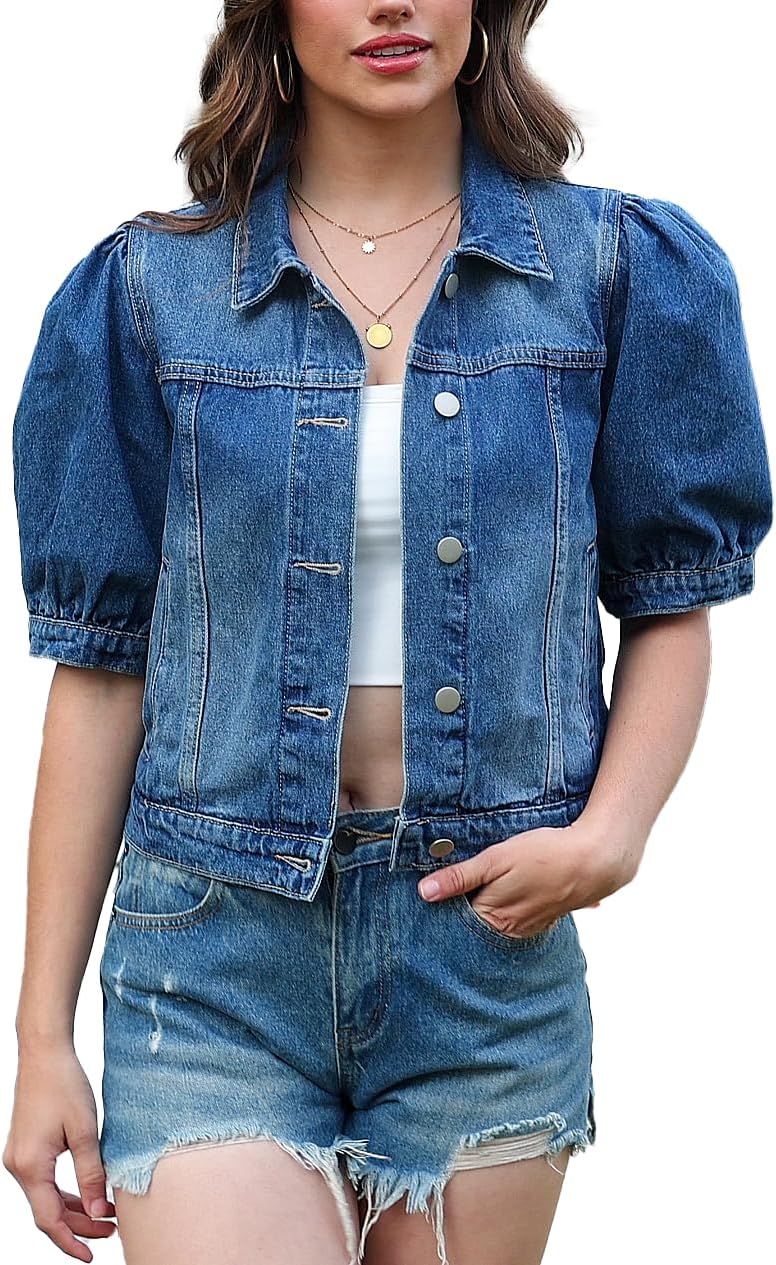 andy & natalie Women's Jean Jacket Cropped Short Puff Sleeve Trendy Denim Jackets with Pockets