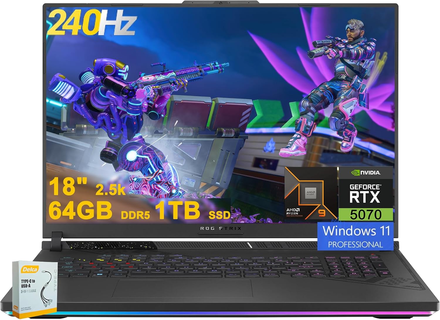 KEY SPECIFICATIONS: PC Type: Gaming Laptop Computer PC Series: ASUS ROG Strix G18 G814 Processor: AMD 16-core Ryzen 9 9955HX Memory: 32GB DDR5 Storage: 1TB SSD Graphics: NVIDIA GeForce RTX 5070 8GB Display: 18" 2560x1600 IPS 240Hz (100% DCI-P3) Communications: Wi-Fi6E Keyboard: 4-zone RGB Backlit Audio: Smart Amp, Dolby Atmos, AI Noise-canceling Operating system: Windows 11 Pro Webcam: FHD Camera Ports & Slots: 2x USB-A 3.2, 1x Type USB 4, 1x HDMI 2.1 FRL, 1x RJ45 Ethernet Battery: 90Wh Additional Information: Dimensions: 11.57" x 15.71" x 1.21" Approximate Weight: 6.62 pounds
