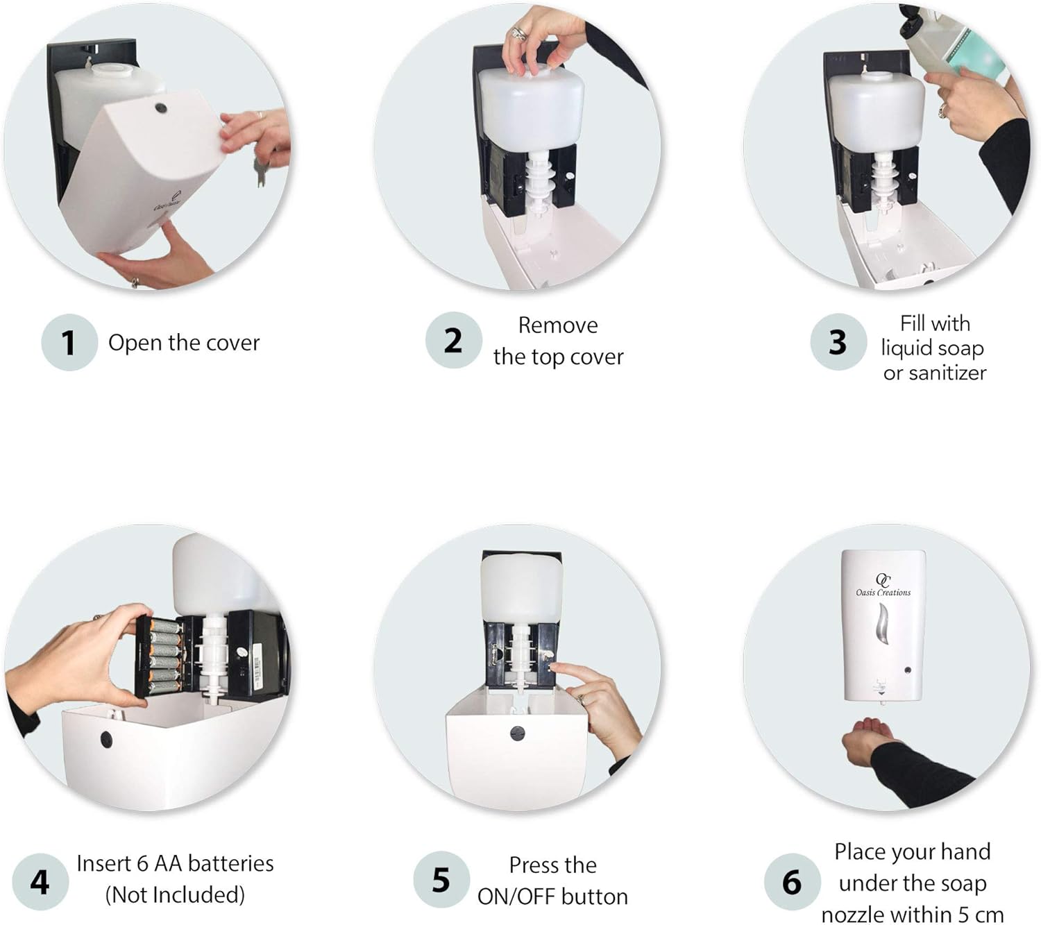 • QUALITY & VALUE: Oasis Creations’ Auto Soap Dispenser is made of DURABLE and STRONG white plastic. Suitable for COMMERCIAL or RESIDENTIAL use. Great for home, offices, hotels, parks, and other public areas. Product Dimensions: 9.5" x 5.5" x 5".