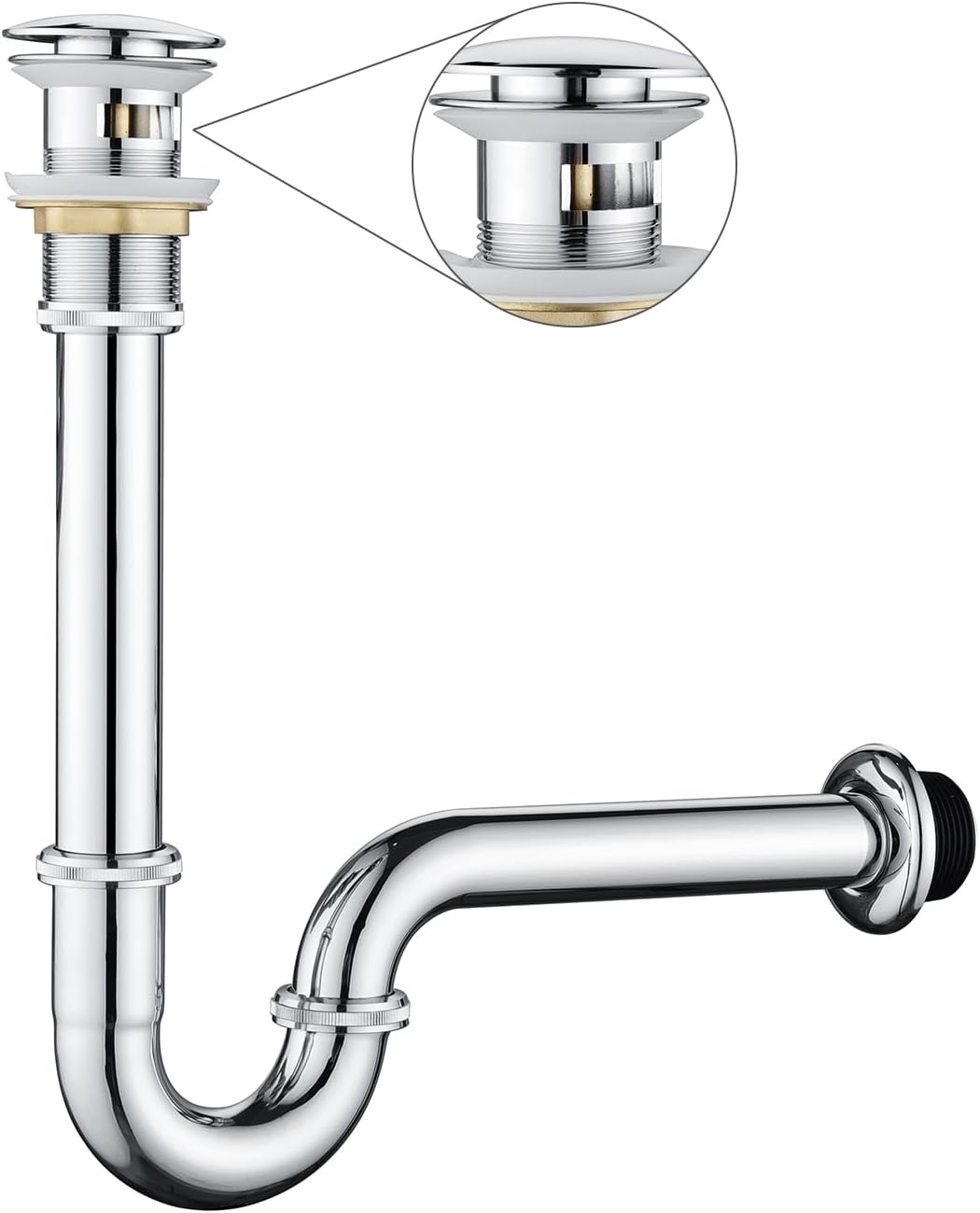 SPECIFICATIONS:Core Stopper Material: Brass.Tailpiece Material: SUS304 Stainless Steel.Surface Finish: Brushed Nickel Gold.Overflow: Without Overflow.Height Range: 13.77-15.35 inches (350-390 mm).Diameter of the Pop-Up Cap: 2.6 inches (66mm).Product Net Weight: 550g approx.Sink Hole Size: 1.61-1.9 inches (40.9-48.2 mm).Max. Thickness: 1.97 inches (50mm).Tailpiece O.D.: 1.22 inches (31mm).PACKAGE INCLUDES: 1 x Brushed Gold Sink Stopper Complete Set, other accessories needed.U-shape sink stopper bottle P trap set with flange and extension tube. 1-1/4 inch Slip Inlet. Fit US/CA plumbing standard.For any questions, please feel free to contact, thanks for your support!