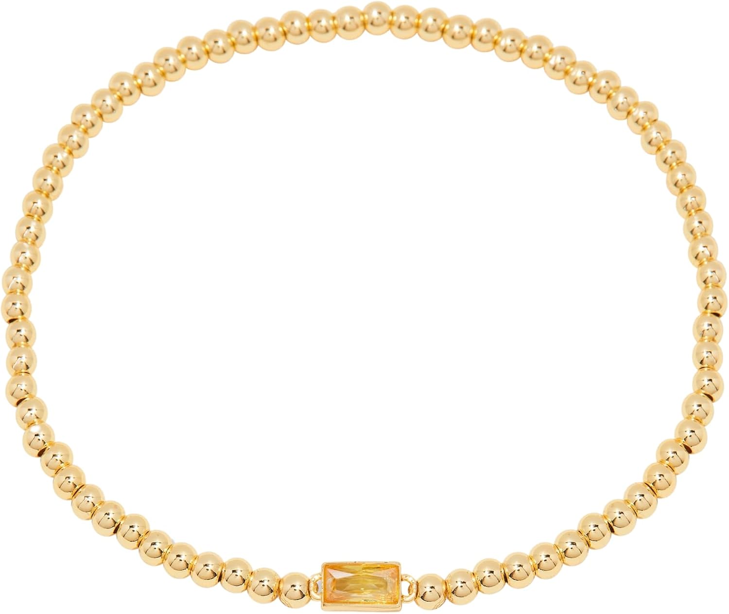 Say goodbye to lonely wrists - rock the Kylie Birthstone Bracelet and show your personality! Made from shimmering gold and featuring your favorite birthstone, this beaded bracelet is the perfect addition to any ensemble. Available in 14k gold plated or rhodium plated brass Birthstone size: 1/4"x1/8" 7" stretch bead bracelet Protected with an anti-tarnish barrier NOTE - Birthstone color may slightly vary per the color chart. SKU: BYB1230