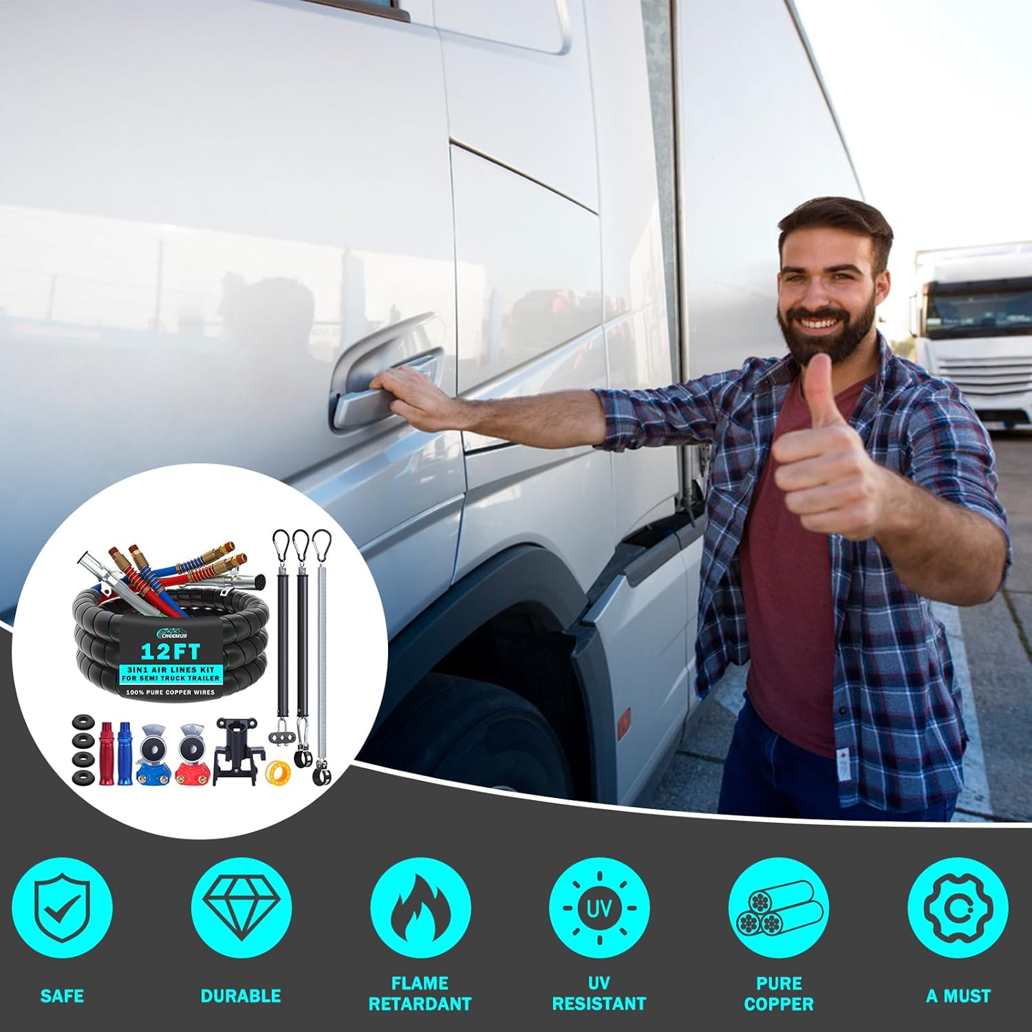 | Included Components | 12FT Red&Blue 3-in-1 Air Lines Kit, 3 Pcs Tender Spring Kit, Gladhand Seals & Teflon Tape, Gladhands with Handles & Holder |