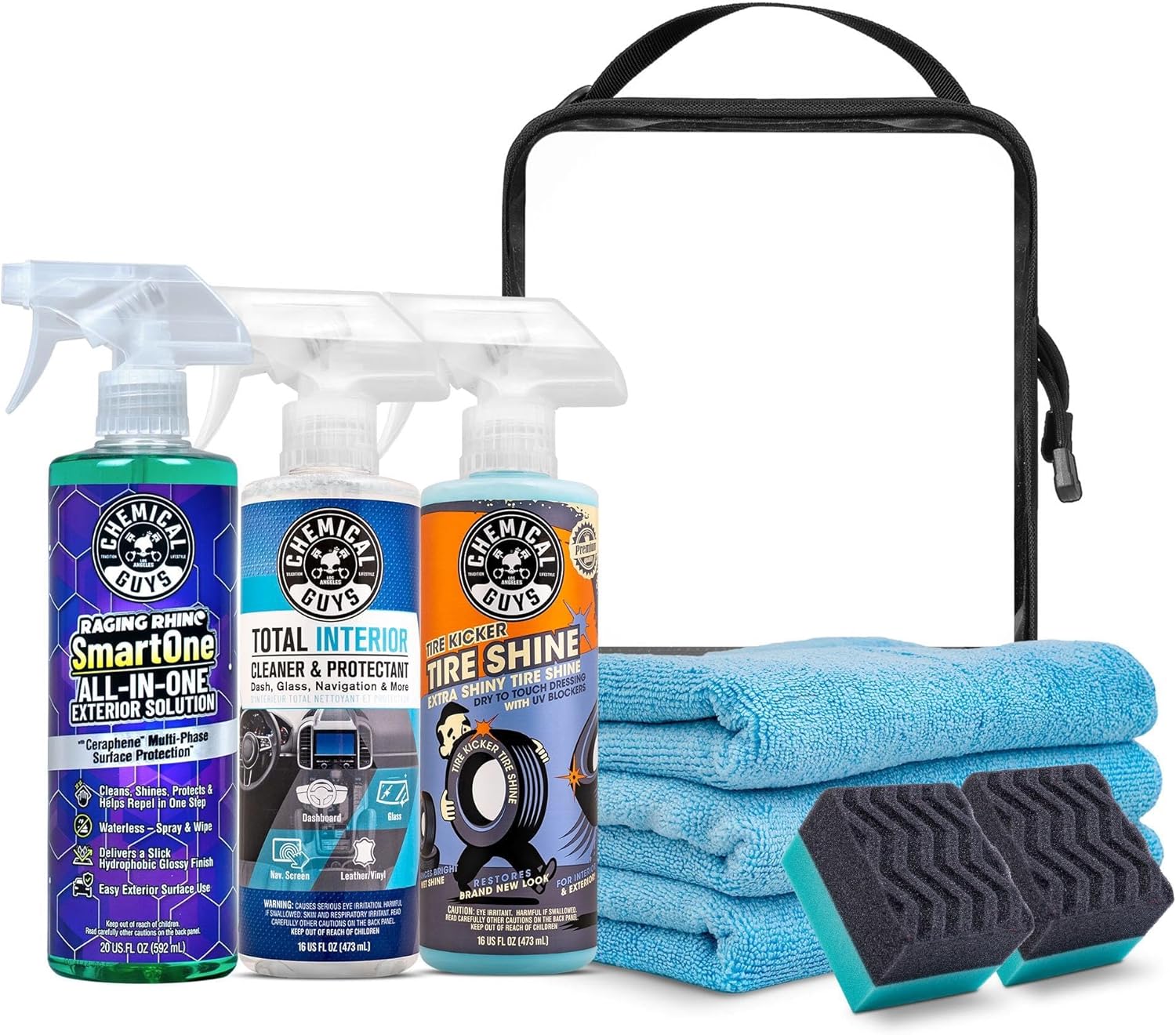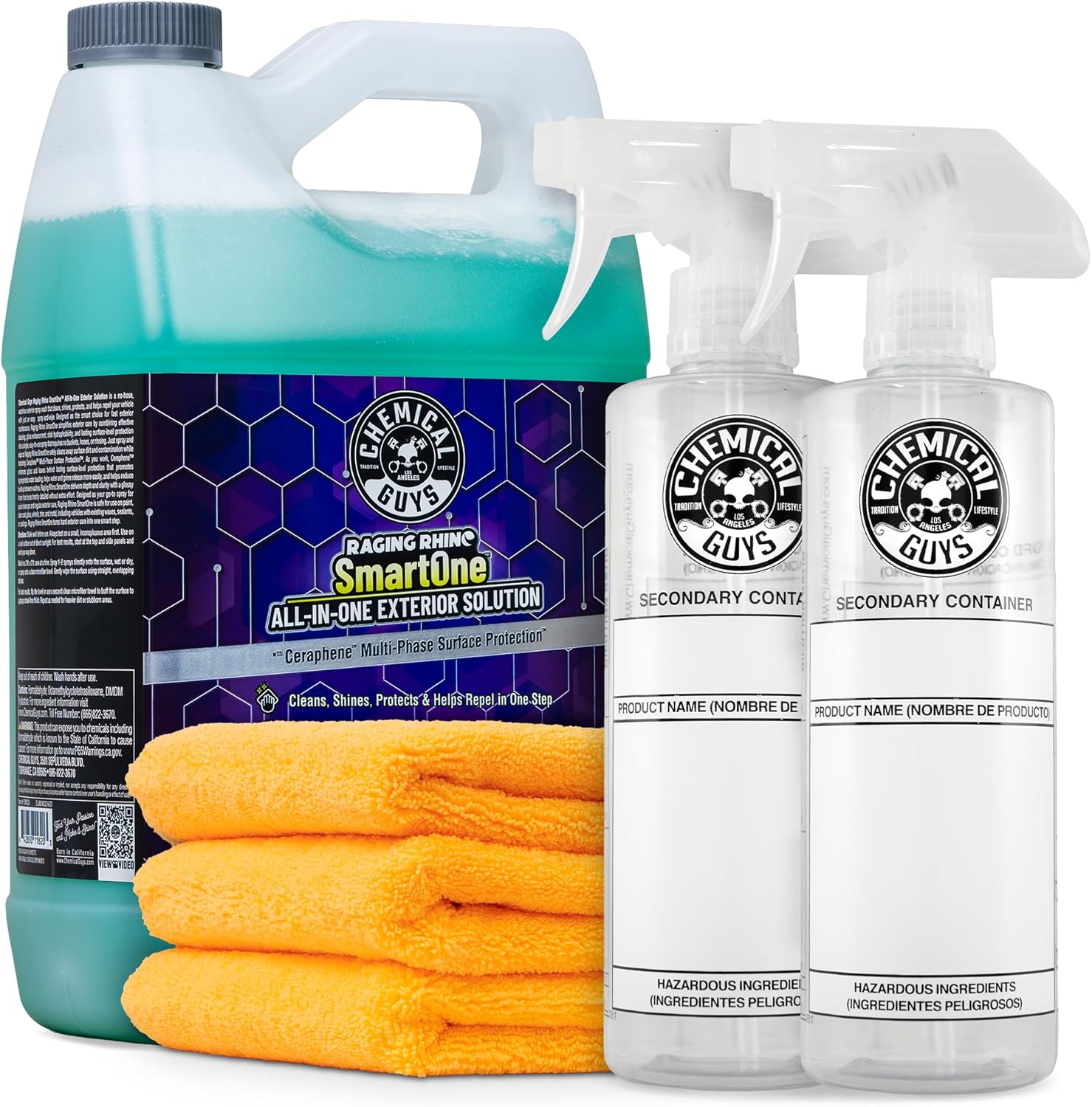 Tired of juggling a waterless wash, quick detailer, and spray wax? Raging Rhino SmartOne collapses all three into a single spray-and-wipe formula powered by Ceraphene Multi-Phase Surface Protection — Chemical Guys' most advanced hydrophobic technology. Spray it on, wipe it off, and walk away with a clean, glossy, protected surface in minutes. No hose. No bucket. No rinsing.Ceraphene is not a marketing term — it is the engine behind the performance. As you wipe, it deposits a ceramic-like protective layer that repels water, resists dust and pollutants, and helps keep your vehicle cleaner between uses. This is a maintenance wash and protectant, not a paint correction tool: scratches, swirl marks, and water spots require polishing before applying. What Raging Rhino does exceptionally well is clean light to moderate surface contamination — dust, fingerprints, pollen, and fresh road film — and leave behind real, measurable hydrophobic protection with every use. For heavily soiled vehicles caked with mud, tar, or bug splatter, a full pre-wash first is recommended. Apply on a cool surface out of direct sunlight, work panel by panel with a clean microfiber towel in straight overlapping strokes, and buff to a streak-free, glossy finish. Safe on paint, clear coat, glass, wheels, chrome, trim, and metal. Not formulated for interior use. Does not remove existing water spots or swirl marks — those require dedicated correction before use. Paint will not feel glass-smooth unless clayed or polished beforehand; Raging Rhino maintains a surface, it does not resurface one. Compatible with existing waxes, sealants, and ceramic coatings.Pair with Chemical Guys Workhorse Professional Microfiber Towels for optimal streak-free results. Trusted by professional detailers and over 1.2 million customers worldwide.
