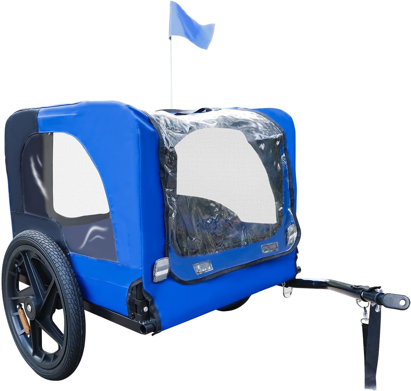 Premium Bike Pet Trailer for Dogs – Heavy-Duty Folding Carrier with Quick-Release Wheels & Universal HitchTake your furry friend on every adventure with our heavy-duty bike pet trailer, designed for both small and large dogs (up to 88 lbs). Built with a sturdy folding frame, quick-release wheels, and a universal bicycle coupler, this trailer ensures safety, comfort, and convenience for all your rides.Key Features:✔ Weatherproof & Breathable DesignMade with water-resistant, durable fabric and a 2-in-1 canopy + mesh shield, this trailer keeps your dog protected from rain, wind, and bugs while allowing optimal airflow through multiple ventilation points.✔ Ultra-Stable & Foldable FrameThe patented folding mechanism allows for quick storage and transport, while the 16-inch air-filled rubber wheels provide smooth, all-terrain performance. Easily inflate tires with a standard bike pump for hassle-free maintenance.✔ Safety-First ConstructionAdjustable internal leash prevents pets from jumping outNon-slip floor for secure footingRear zippered entry for easy access and extra securityReflective strips + safety flag for high visibility in low-light conditions✔ Universal Bike CompatibilityWorks with most adult bicycles thanks to the included universal hitch coupler. Whether you're commuting, trail riding, or running errands, your pet can join you safely.✔ Spacious & Comfortable InteriorWith ample ventilation and a roomy interior, your dog can relax and enjoy the ride. Perfect for breeds like Beagles, Border Collies, Labradors, and more!Why Choose Our Bike Pet Trailer?✅ Durable & Long-Lasting – Powder-coated steel frame + rip-resistant fabric✅ Easy to Store & Transport – Folds compactly in seconds✅ All-Terrain Ready – Sturdy wheels handle pavement, gravel, and light trails✅ Multi-Functional – Use as a bike trailer, jogger stroller, or travel carrierBring your pet along safely—wherever your wheels take you! 🚴🐕Optimization Highlights:Structured for readability with clear bullet points and bolded keywordsCombined all key specs from the original title & descriptionAdded emotional appeal ("Take your furry friend on every adventure")Highlighted versatility (multi-use functionality)