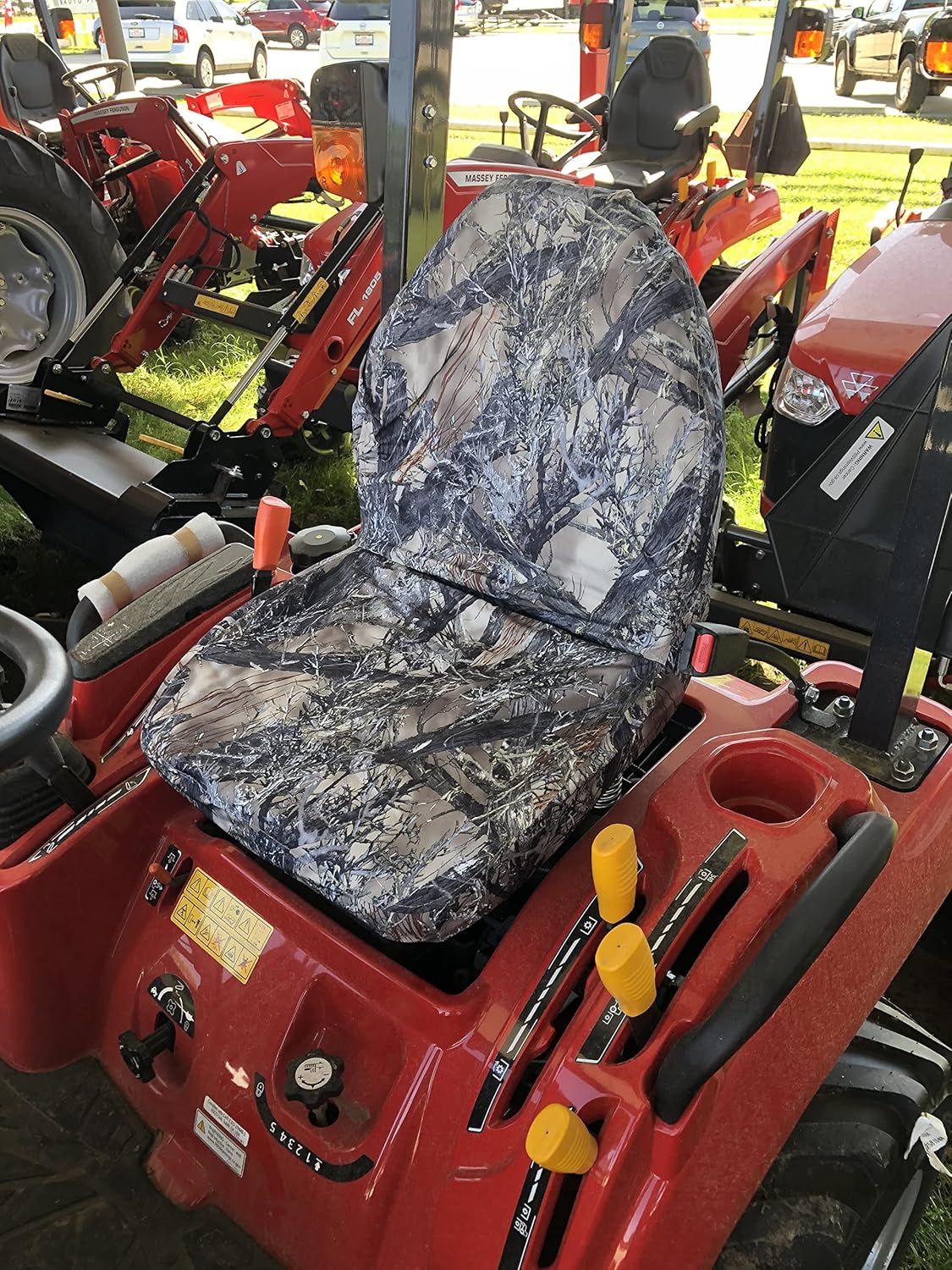 Exact fit waterproof RED seat covers for high back, fold forward seat with drain hole in current Massey Ferguson Tractors. Not for Cab models.