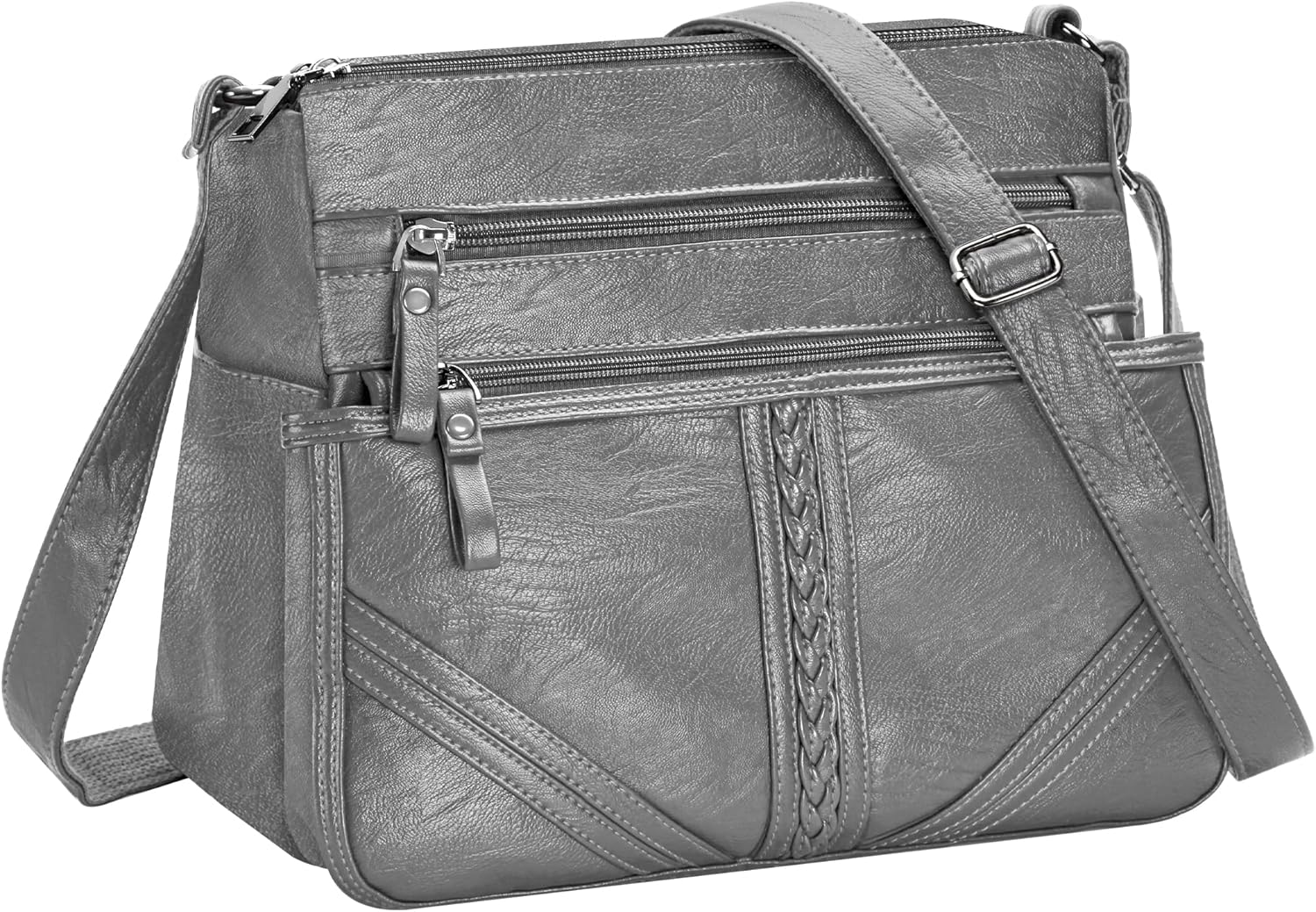 Stylish PU leather Crossbody Bag for Women Features: High quality PU leather,soft,comfortable,light weight shoulder bag . multi-zipper closure and multi-pockets design pocketbooks for women . ajustable shoulder strap. With internal and external pockets for different items, easy to organize your items. Big capacity. Spacious compartment can fit Ipad mini, cell phone, perfume, lipsticks, glasses, watch, keys. Free worry for outing. Multi-Functions. Suitable for different occasions, like daily, shopping, party, work,trips. A ideal gift in special day, like Christmas, Birthday, Thanksgiving Day, Valentine's Day, Graduation etc for you or your import one. Specifications: Material:washed PU leather Dimension: 10.6*4.7*9.4inches Weight: 0.68lb Package List: 1 x Crossbody Bag