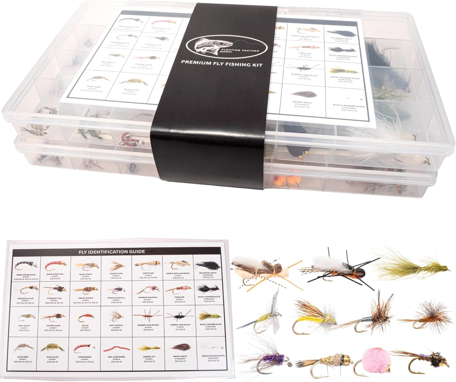 THE FLY FISHING FLIES KIT THAT ACTUALLY CATCHES FISH – AVAILABLE IN 64, 152 & 268 PIECE OPTIONS Whether you're a first-time fly angler learning the basics or a seasoned pro restocking your go-to box, this hand-tied fly fishing flies assortment delivers the patterns that produce tangible results – not just pretty flies that sit unused in your tackle bag. CHOOSE YOUR KIT SIZE: 64-PIECE FLY FISHING KIT – Perfect Starter Set - Balanced mix of dry flies, nymphs, streamers, and terrestrials - 1 waterproof fly box included - Laminated Fly ID Card for learning each pattern - Ideal for beginners or as a travel/backup kit 152-PIECE FLY FISHING KIT – Expanded Collection - Broader variety covering more hatches and water types - 1 large waterproof fly box included - More pattern options for seasonal fishing - Great for intermediate anglers building their arsenal 268-PIECE FLY FISHING KIT – Complete Fly Arsenal - Comprehensive collection covering virtually every fishing situation - 2 waterproof fly boxes included for organization - Maximum versatility from high mountain streams to warm water ponds - The serious angler's go-to kit WHAT'S INSIDE EVERY KIT: - Dry Flies – High-floating patterns including Adams, Elk Hair Caddis, Royal Wulff, and Parachute variants for surface action - Nymphs – Subsurface producers like Pheasant Tails, Hare's Ears, Prince Nymphs, and Zebra Midges that catch fish when nothing else works - Streamers – Woolly Buggers, Muddler Minnows, and sculpin patterns for aggressive takes - Terrestrials – Hoppers, ants, and beetles for summer bank fishing - Laminated Fly ID Card – Learn each pattern with our quick-reference guide - Waterproof Fly Box(es) – Durable storage with secure silicone foam inserts DESIGNED FOR EVERY FISHING SITUATION: From high mountain streams chasing wild trout to warm water ponds targeting bass and panfish, this fly fishing gear collection covers the primary food sources fish feed on across North America. Match the mayfly hatch in spring, throw hoppers in summer, swing streamers in fall, and fish midges year-round. WHY ANGLERS CHOOSE OUR FLY FISHING ACCESSORIES: ✓ Hand-tied by experienced fly tyers – not mass-produced machines ✓ Chemically sharpened hooks for better hooksets ✓ UV-resistant threads that won't fade or unravel ✓ Expert-selected patterns proven across diverse fisheries ✓ Clear sizing and counts – no surprises when your box arrives ✓ Three size options to match your experience level and needs THE FLOATING FEATHER GUARANTEE: We stand behind every fly in every kit. If you're not satisfied with the quality or catching more fish, contact us, and we'll make it right. Period.