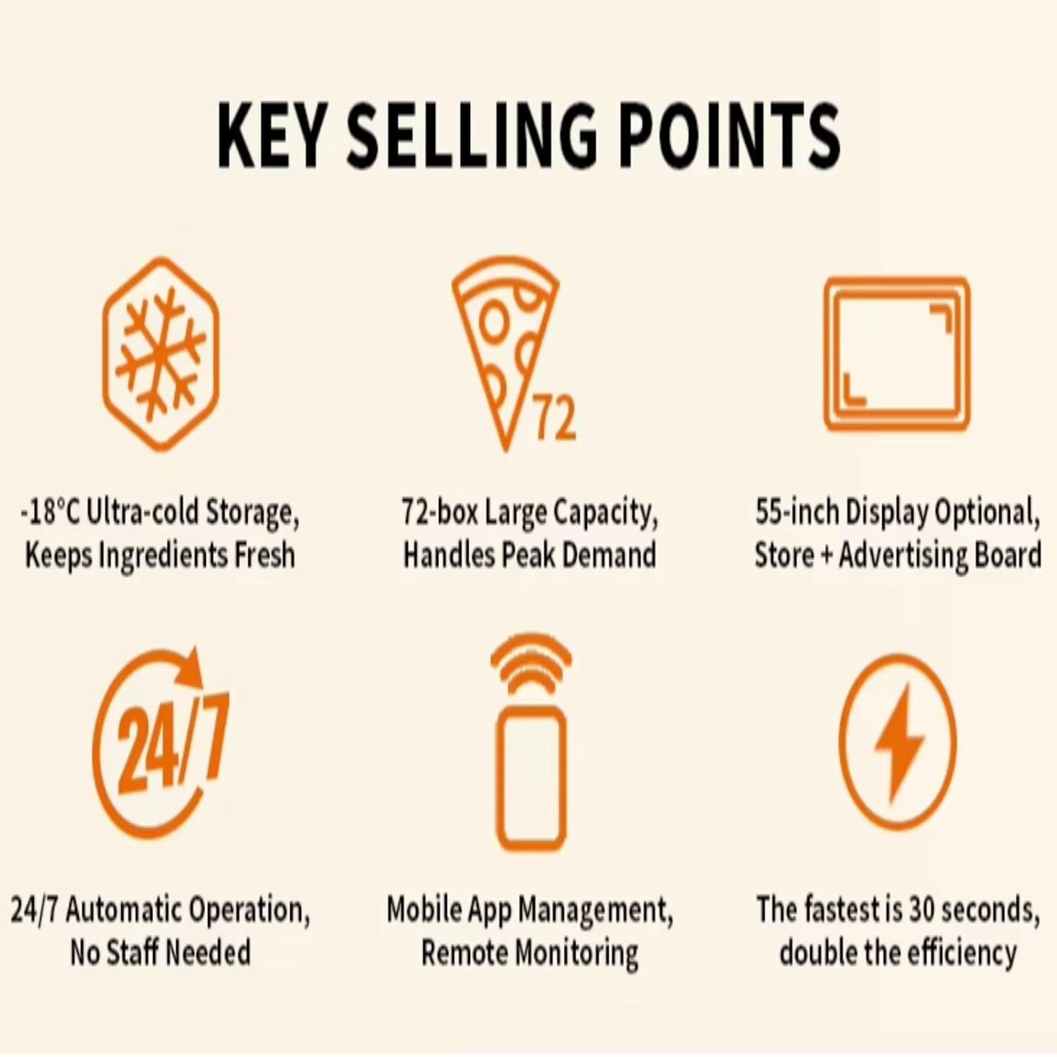 Our automatic pizza vending machine combines robotic automation with commercial-grade refrigeration, delivering restaurant-quality 10-inch pizzas in just 3 minutes. Perfect for unattended retail locations—gas stations, college campuses, hospitals, and office parks—this smart pizza kiosk turns any high-traffic area into a profitable pizzeria. FEATURES Robotic Automation & 3-Minute High-Speed Cooking Dual-Zone Temperature Control for Maximum Freshness Enabled Remote Management & Multi-Payment Integration SPECIFICATIONS Model: PVM-3200 Pro Dimensions: Customizable Weight: depending on configuration Capacity: 69-72 pre-packaged pizzas (8"/10"/12" sizes) Oven Temperature: Up to 350°C (662°F) with air convection heating Refrigeration Range: -3°C to -15°C (26°F to 5°F) adjustable Power Supply: 110V/220V/380V available, 6800-7500W Payment Systems: Bill/coin acceptor, card reader, NFC, QR code, mobile app Connectivity: 4G LTE/5G/Wi-Fi/Ethernet with remote monitoring software Construction: Heavy-duty galvanized steel, food-grade stainless steel interior surfaces