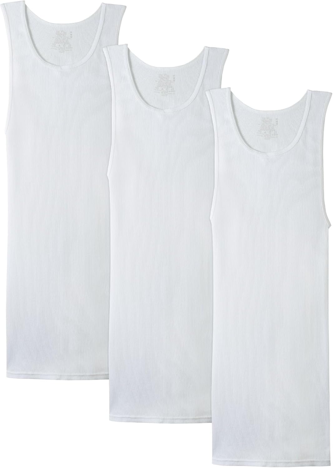 Fruit of the Loom Men's Classic White Tanks are comfortable and versatile as an every day undershirt. They are made with super-soft, 100% cotton ribbed fabric, providing a cool and comfortable fit that forms to your shape. These a-shirts have generous length that stay tucked in all day and keep you comfortable in every situation. These sleeveless undershirts are comfortable and light enough to be worn as an extra layer without adding extra warmth to an outfit. Each undershirt wicks away moisture so you can stay cool and dry.