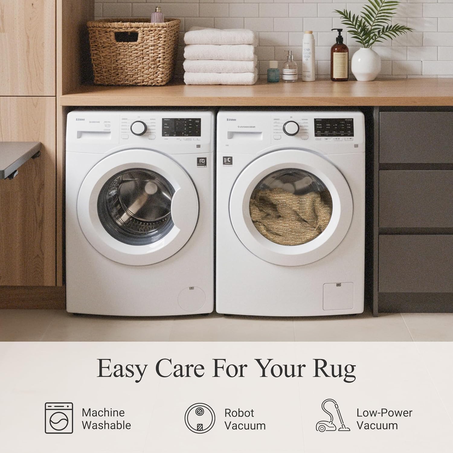 | Product Care Instructions | Easy Care Guide: 1.Robot vacuum & regular vacuum friendly 2.Machine wash cold on gentle cycle (bleach-free detergents only) 3.Air dry or low-heat tumble dry (no high heat) 4.Hand-woven, non-toxic & sustainable 5.Made with recycled microfiber polyester + recycled cotton, Smoothing Out Creases: Creases are normal after shipping. To remove them: 1.Reverse fold the rug along the crease lines. 2.Iron on low heat for 10 minutes using a protective cloth barrier (never iron directly). 3.Place heavy objects on the area and let sit for 24 hours. |