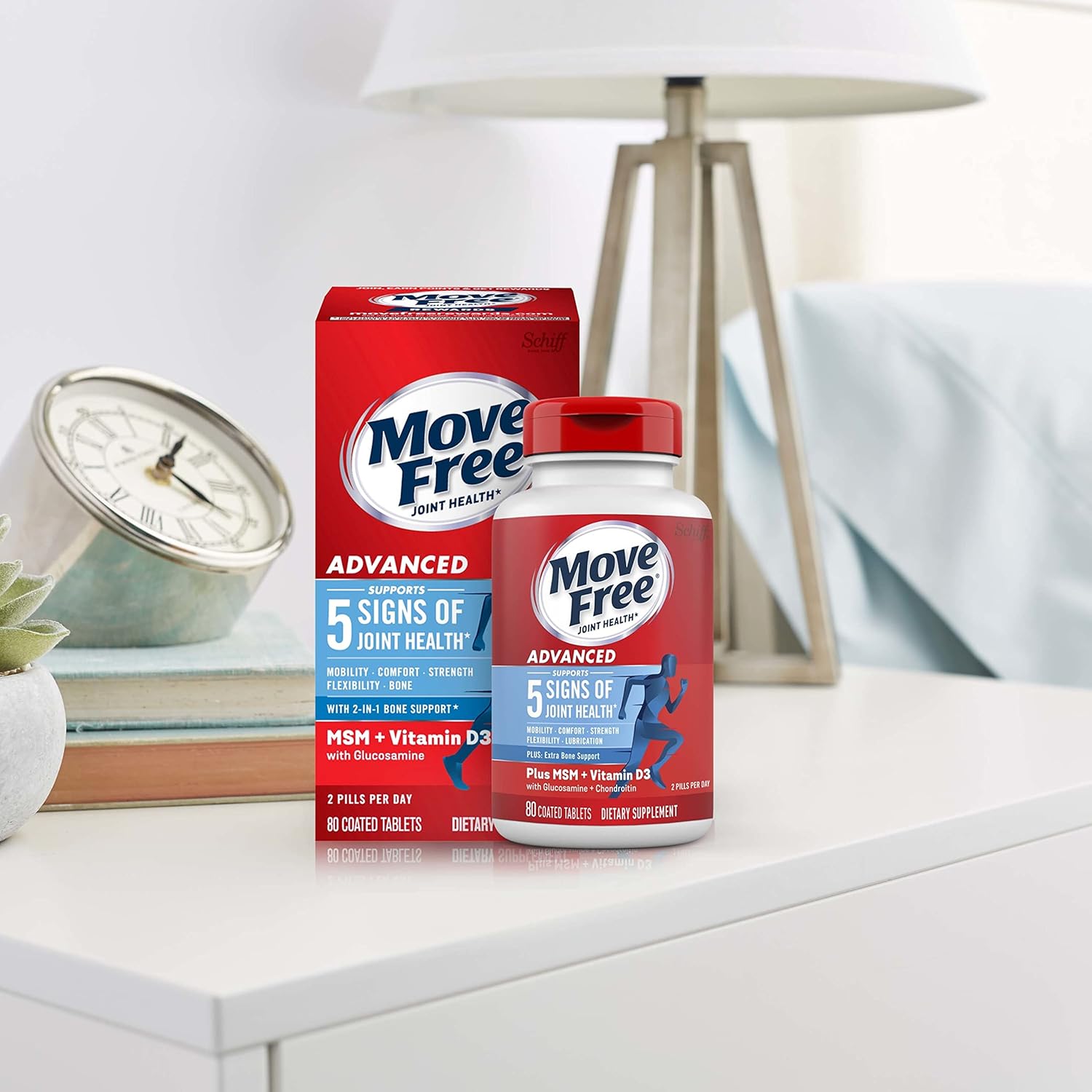 Move Free Advanced + MSM + vitamin D3 is a Glucosamine Chondroitin joint supplement that supports 5 signs of joint health (mobility, flexibility, strength, lubrication and comfort) and provides extra Cartilage and Bone support so you can do the things you love. Glucosamine is key for the formation of cartilage, an essential building block of your joints to support your mobility and flexibility. Chondroitin is a building block of cartilage that supports joint strength by helping to resist compression in the joint. In the body, Chondroitin functions by attracting fluid to joints to support cushioning and lubrication. Uniflex (FruiteX-B Calcium Fructoborate) is a clinically tested mineral complex that supports joint comfort in as little as 2 weeks 1. Hyaluronic Acid (HA) is the same molecule found in healthy joint fluid. HA has been reported to support joint lubrication and smooth movement. As we get older, levels of HA tend to decrease. Methylsulfonylmethane (MSM) is a souce of sulfur found in the body that is important in the formation of collagen in joints, collagen is a vital part of your joints because it supports the structure of cartilage. Vitamin D3 helps maintain healthy levels of Calcium and Magnesium, important minerals that support strong bones. Because joints receive their essential nutrients through their adjoining bones, healthy bones are key for healthy joints.٭ ٭THESE STATEMENTS HAVE NOT BEEN EVALUATED BY THE FOOD AND DRUG ADMINISTRATION. THIS PRODUCT IS NOT INTENDED TO DIAGNOSE, TREAT, CURE, OR PREVENT ANY DISEASE. 1 J Aging Res Clin Pract 2014; 3(4):223-228