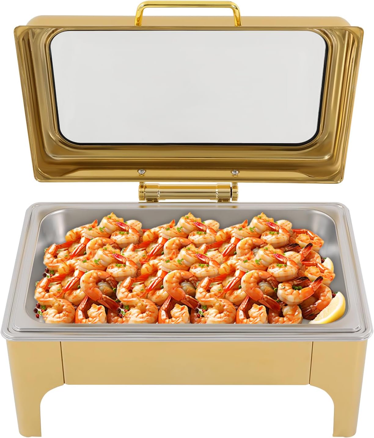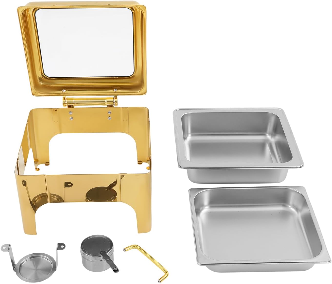 DetailsFortress Feet: The four angled stainless steel legs firmly grip the ground like climbing anchors, and even when the basin is filled with food, they won't roll over, just like having four invisible hands holding it steady.Rounded Corners: This design helps to protect you from scratches, making it more reassuring to use. Clear Lid: The high-definition glass acts as a miniature monitor, allowing you to see what's going on inside the basin through the lid, so you don't have to lift the lid repeatedly to check on your dish and lose heat.Fuel Holder Lid: You can extinguish the firepower by controlling its opening and closing.ApplicationThis product can be used to hold meat, vegetables, noodles, seafood, and other foods, and is very suitable for large gatherings, events, buffets, hotels, brunch, catering, parties, wedding banquets, and self-service restaurants.SpecificationColor: GoldShape: RectangleStyle: ModernMaterial: Stainless Steel, GlassProcess: Polishing, Gold-platingMounting Type: Table MountAssembly Required: YesIs Dishwasher Safe: Yes (Only for Food Basin)Applicable Heating Type: Solid Alcohol (Not Included)Capacity: 6L/6.34QtProduct Size: 44*39*28cm/17.32*15.35*11.02inPackage Size: 41*41*33cm/16.14*16.14*12.99inGross Weight: 7.3kg/16.09 lbsNet Weight: 6.93kg/15.28 lbsPackage Included1* Food Basin1* Water Basin1* Frame 1* Fuel Holder 1* Fuel Holder Tray1* HandleNotes1. Please note that food and fuel are not included.2. The chafing dish is used to keep food warm and cannot be used as a cooking tool. It is forbidden to put the product directly on the gas or induction stove.3. Please remember to wear gloves (not included) during the operation to prevent accidental burns. 4. Please add an appropriate amount of water to the water tray before use. Please note that the water tray can not lack water. 5. This type of stainless steel cutlery is not suitable for cleaning with steel wool; it should be hand-washed with hot, soapy water and then rinsed thoroughly. Please air dry immediately after washing. Please avoid using salt solutions, acidic foods, or harsh detergents to maintain the finish.