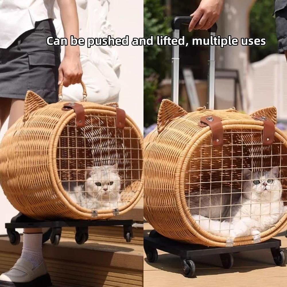 Materials: PE rattan + iron frameIs it necessary to install: NoPacking:1*rattan cat strollerNote:1. We are manually measuring, there may be an error of 1-3cm, please prevail in kind.2. Due to the different monitor and light effect, the actual color of the item may be slightly different from the pictures. Thank you for understanding!Experience effortless, elegant pet travel with our Handwoven Rattan Pet Stroller with Wheels and Telescopic Handle—a suitable blend of traditional craftsmanship and modern utility. This beautifully designed stroller isn't just for function; it's a fashion-forward statement piece that complements your lifestyle while keeping your furry companions comfortable and secure.Crafted by skilled artisans, the natural rattan weave offers a lightweight yet sturdy frame that stands out in any crowd. The upgraded 5-wheel system—including smooth-gliding swivel casters—ensures quiet, stable movement across various surfaces. The telescopic handle extends with ease, letting you switch between pulling and pushing depending on the scene.From weekend markets to campsite adventures, this multi-functional trolley delivers both convenience and visual appeal. With no-fuss mobility, spacious interior, and refined details, it’s more than just a pet box—it’s a lifestyle upgrade for pet lovers who travel in style.