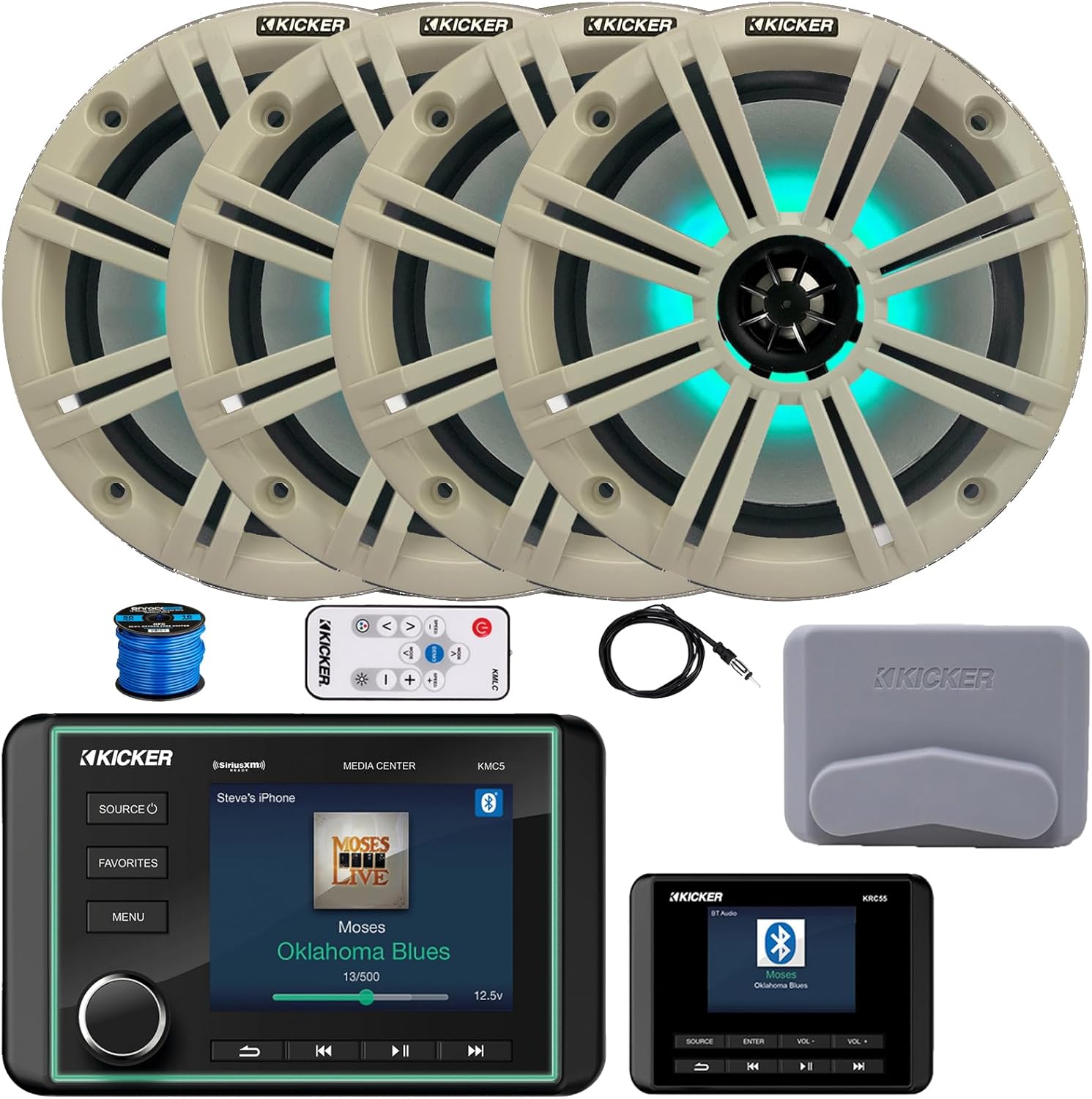 Receiver:Charging USB w/Thumb-Drive PlaybackBluetooth ConnectivityFull-Color LCD DisplayAbility to control Zone 2SiriusXM ready3” Hole CutoutDedicated Zone 2 speaker outputsNMEA PortVideo RCA Input with Remote trigger wireAM/FM and Weather-band TunerUp to 16 Favorites for each source: AM, FM and SiriusXMFront, Rear, Subwoofer and Zone-2 RCA OutputsAUX RCA InputDay/Night ModeLow Battery alertLoudness controlCustomizable EQ with Five PresetsVoltage DisplayIncluded in the bundle- Wired Digital Remote ControllerSpeakers:Four-Ohm Voice Coil300 Watt Peak Power / 150 Watts RMSOne-Inch Titanium TweeterUV-Treated Polypropylene Woofer With Santorini SurroundUV-Resistant Polymer BasketLocking/Sealed Terminal CoverSealed Motor StructureSeven-Color LED System Included4-Ohm ImpedanceMulticolor LED Lighting CapabilityComes in bulk packaging with no additional hardware or accessories8" Charcoal Grille- INCLUDEDLED Controller- INCLUDEDRadio Antenna:22" AM/FM Marine AntennaImproves Radio receptionSpeaker Wire:Connects audio speakers to your Audio Video (A/V) receiver or amplifier.Marine grade wireOxygen Free Copper (OFC)Length: 50 FeetGauge: 16