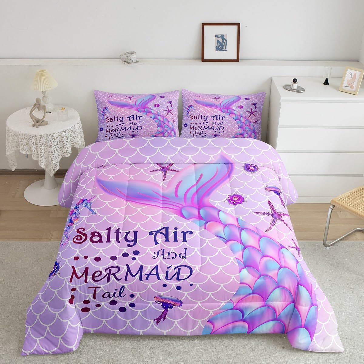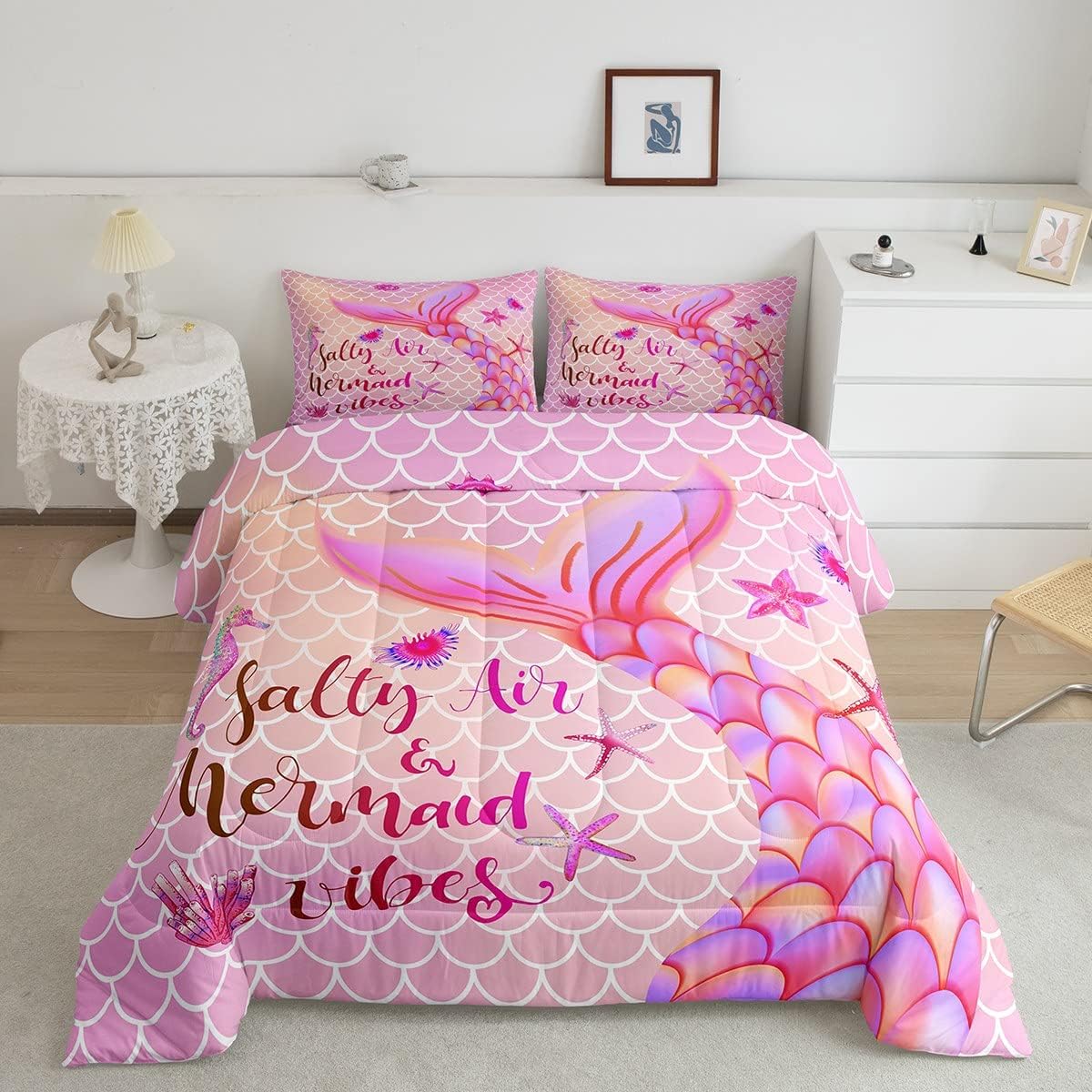 Mermaid Tail Comforter Set for Kids,Full Size Mermaid Bedding Sets for Girls,Gradient Rainbow Fish Scale Quilt Set,Pink Watercolor Sealife Seahorse Nautical Duvet Insert with 2 Pillowcases