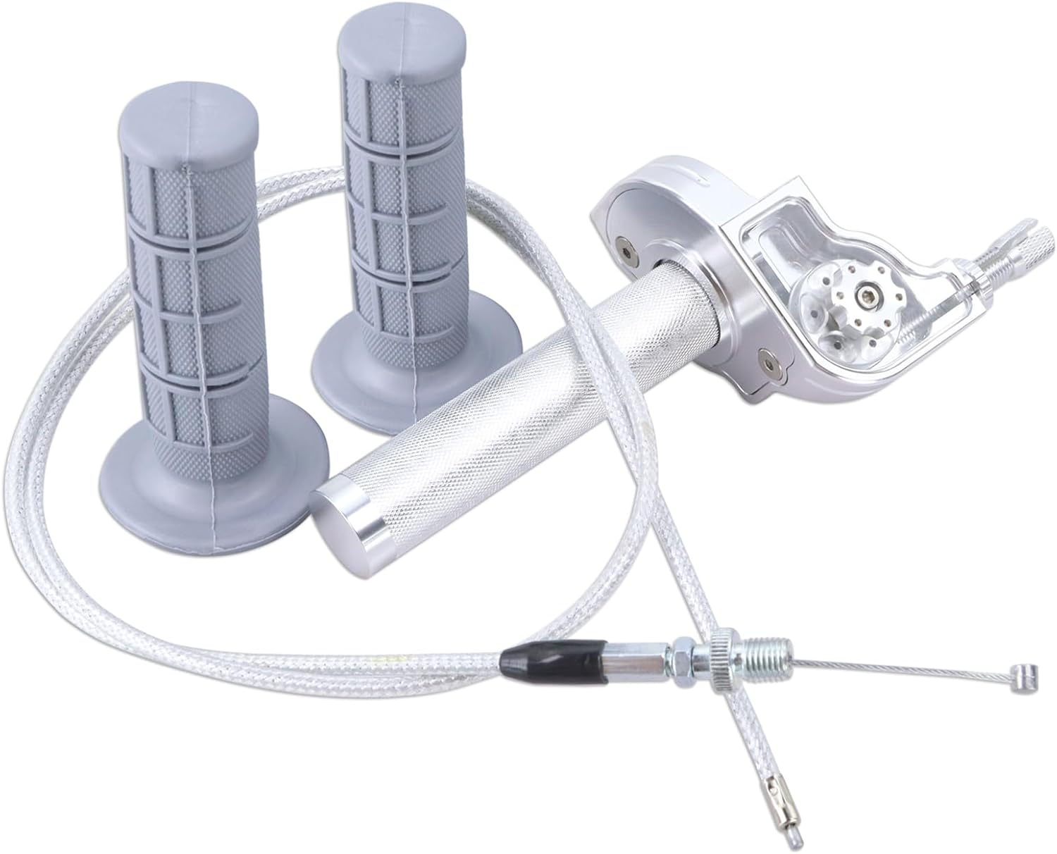Mini Bike Throttle KitCompatible ModelsCompatible with 7/8" (22mm) Handlebars, 50cc-250cc 4-stroke engines, dirt bikes, mini bikes, pit bikes, ATVs, scooters, go-karts.Transparent DesignThe standout twist throttle features a fully transparent shell offering a clear view of the inner cable mechanism, clearly grasping the degree of throttle control and improving handling precision.QualityMade of 6061-T6 CNC aluminum alloy, sturdy and durable. Equipped with anti slip rubber grip, it can reduce fatigue and ensure comfort and safety during long-distance cycling.Package Include1 x twist throttle, 2 x rubber grips, 1 x throttle cable.Our GuaranteeWe give 1 years product quality guarantee for this mini bike throttle kit, during this period you can contact me at any time if you have any problem, I will reply you within 24 hours and solve the problem for you.