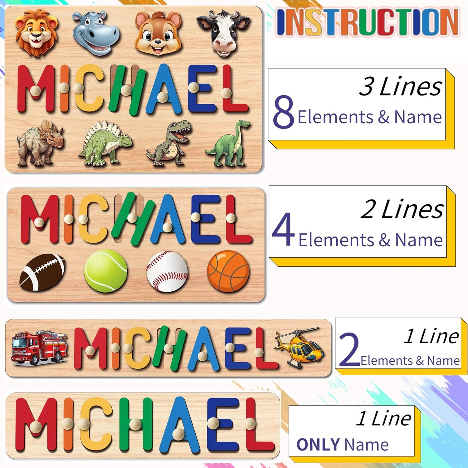 | Included Components | Colorful Letters Puzzle, Cute Elements Puzzle, Wood Name Puzzle, Wood Puzzle Board |