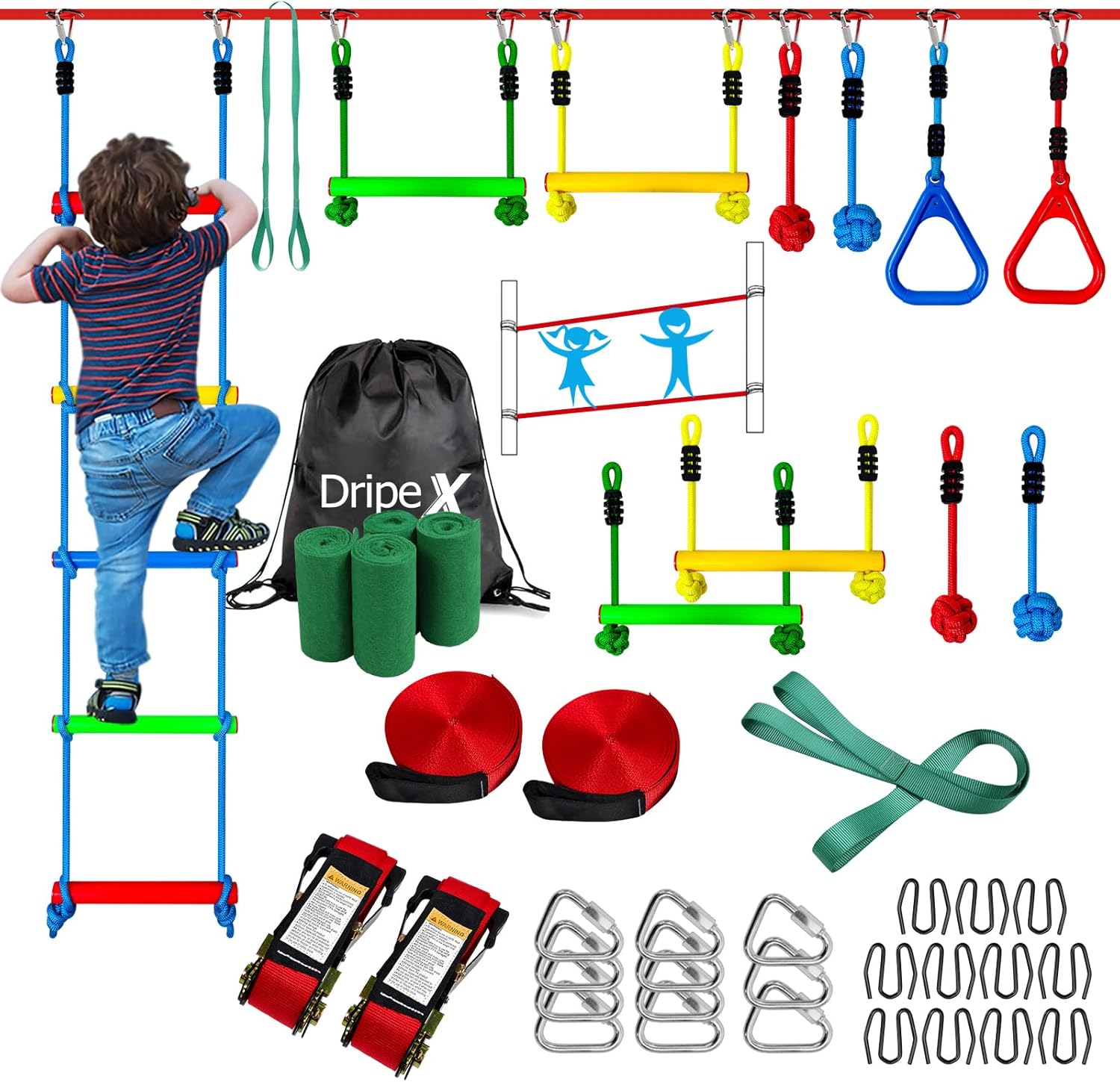 | Included Components | 3.3FT Tree Protectors x 4 + Webbing Buckles x17 + Connecting Buckles x 17 + Carrying Bag x 1, 50FT Slacklines x 2 + 5.9FT Ratchets x 2, Swing x 1 + Trapeze Swing x 1 + Rope Ladder x 1 + Climbing Net x 1 + Monkey Fists x 2 + Monkey Rings x 2 + Monkey Bars x 2 + 1.2M Arm Trainer x 1, Visual Instruction User Manual x 1 |