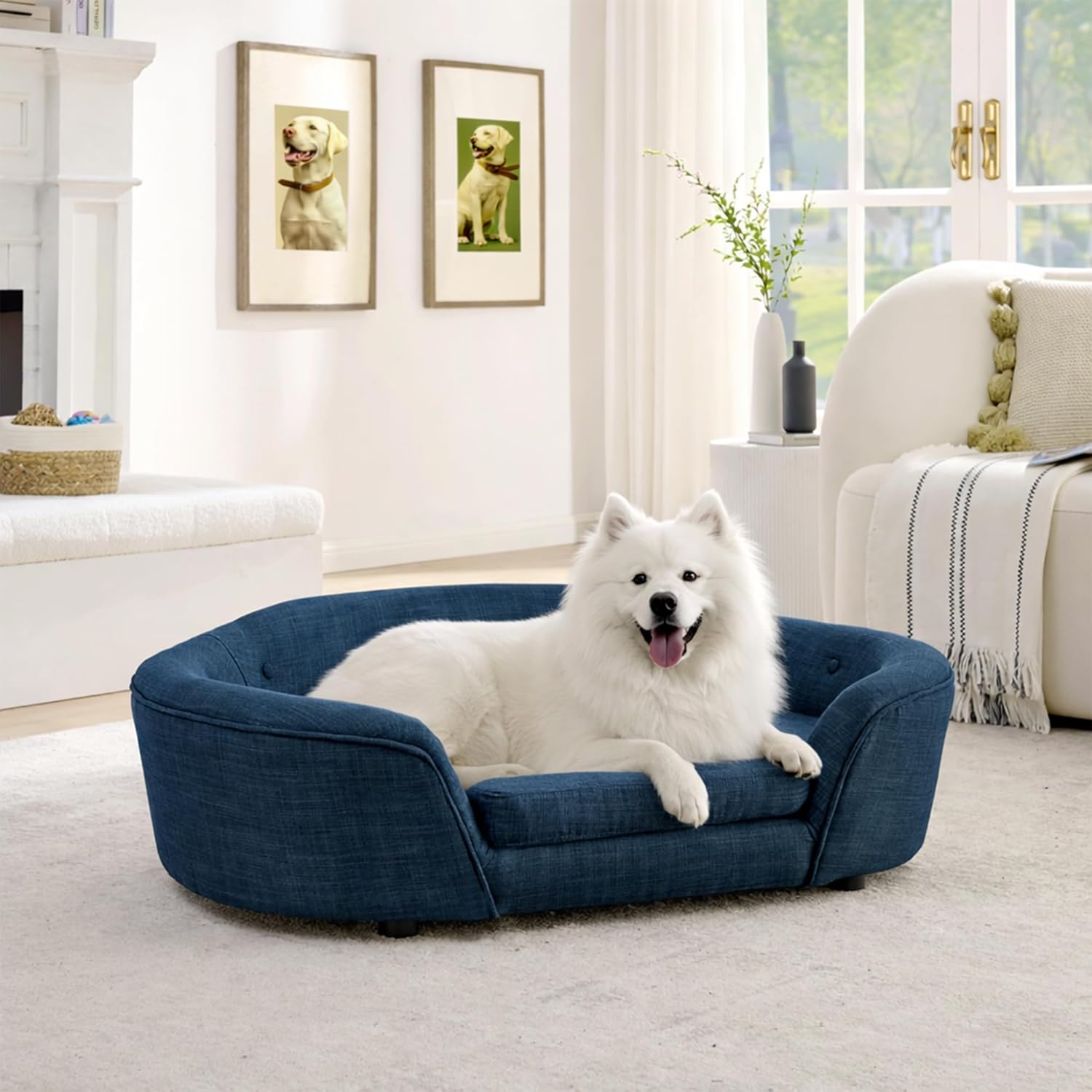 Product FeaturesOval Semi-Enclosed Dog Sofa Couch Bed - A Real Sofa Designed for Your Dog More than just a floor bed, this cloud-style pet sofa is designed to give your dog a true sofa-like place to relax. The raised structure and supportive backrest create a cozy lounging experience that dogs naturally love,whether curling up or stretching out indoors. Orthopedic Comfort with Memory Foam Support The thick memory foam cushion gently contours to your pet’s body, helping relieve pressure on joints and the spine. Ideal for medium and large dogs, senior pets, or dogs that spend long hours resting indoors. Perfect for daily naps, lounging, and extended relaxation in the living room or bedroom. Furniture-Style Design That Blends into Your Home Upholstered in soft yet durable linen fabric, this indoor dog sofa resists everyday wear, stains, and pet hair while remaining gentle on your pet’s skin. Its neutral, furniture-inspired design blends seamlessly into modern living rooms and bedrooms—comfort for your pet without compromising your home’s style. Stable, Anti-Slip & Floor-Friendly Construction Designed with short sofa legs for enhanced stability, the pet couch stays close to the ground,making it easy and safe for medium and large dogs to climb on and off. The removable cushion includes a built-in magnetic anti-slip strip to prevent shifting during movement. Bottom lining fabric and protective plastic foot pads help protect your floors from scratches. No Assembly Required – Ready to Use This pet sofa arrives fully assembled and ready to use right out of the box. While you relax on your couch, your dog or cat can enjoy their own cozy space. The oval, semi-enclosed shape with a supportive backrest provides a calming sense of security,making it a favorite spot for everyday rest and relaxation. Product SpecificationsProduct Type: Indoor Pet Sofa BedRecommended For: Medium & Large Dogs (up to 130 lbs)Overall Dimensions: 42.75" L x 28.75" W x 13.25" HCushion Size: 32" W x 23.5" DCushion Material: High-density memory foamUpholstery Material: Soft, durable linen fabricStructure: Short sofa legs for added stabilityAnti-Slip Design: Magnetic anti-slip strip on cushion baseFloor Protection: Bottom lining fabric & plastic foot padsAssembly Required: NoSuitable Locations: Living room, bedroom, indoor spacesWeight Capacity: Up to 130 lbsNot Recommended For: Extra-large breedsNote: Please measure your pet before purchase