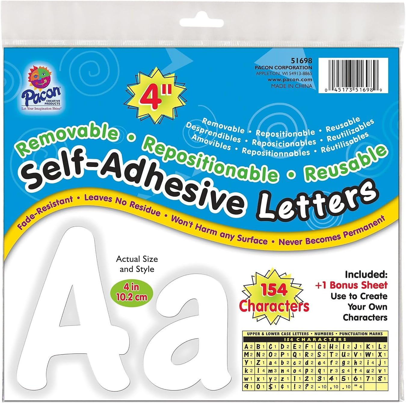 Uniquely removable, repositionable and reusable letters! Just peel and place - no punching out, no staples, push pins or tape needed. Fade-resistant and tear-resistant vinyl. There's no residue, and they won't harm surfaces because the adhesive never becomes permanent. Includes uppercase and lowercase letters, numbers and punctuation marks. 154 characters per package. Capital letters measure approximately 4" tall; lowercase letters measure approximately 3" tall. Acid-free. White. 12 packs of letters total.