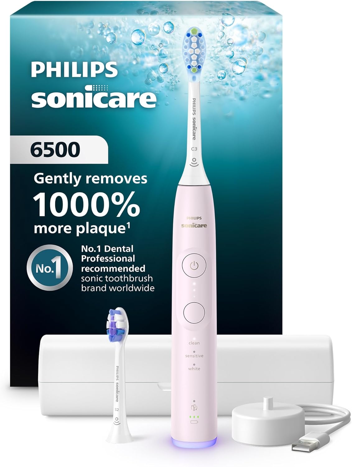 Achieve 1000% more plaque removal¹ and have whiter teeth in 1 day² with the Philips Sonicare 6500 Series sonic toothbrush combined with the C3 Two-in-one electric toothbrush head. Enjoy a powerful yet gentle clean, even in those hard-to-reach areas. This rechargeable toothbrush uses the Next-Generation Sonicare Technology. The motor adjusts power automatically, so there is zero drop in performance when you reach those harder-to-clean areas. Enjoy a gentle yet effective clean for your teeth and gums with 62,000 bristle movements per minute. Sonicare Fluid Action supports the bristles to clean by driving fluid deep between teeth and along the gumline. A visual pressure sensor at its base gently lets you know if you're overdoing the pressure. Simply ease off when it lights up to protect your gums. Give your clean a boost with 9 brushing settings. Whether you want a little more vigor or a specific focus for your clean, you can have it. Choose between Clean, Sensitive and White mode, and pick one of three intensity levels. Achieve your oral health care goals with the Sonicare toothbrush and app. Benefit from guided brushing, tips and tricks, and content personalized to you. Together, you are unstoppable. Ace your session time with Sonicare’s cleaning timers. Every 20 seconds, the BrushPacer will prompt you to clean a new area. After 2 minutes, the SmartTimer will indicate your session is complete. Did you know that brush heads become less effective after three months? Dental professionals recommend changing your brush head regularly, which is why Philips Sonicare toothbrushes have a brush head replacement reminder. It tracks how often and how hard you brush, then reminds you to replace your brush head once it's time for a new one. Experience up to 21 days of regular brushing after a single charge, bringing a new level of convenience to your brushing routine. The included travel case makes it a perfect choice when looking for a travel electric toothbrush. ¹ vs. a manual toothbrush ² in White Mode using a leading whitening toothpaste