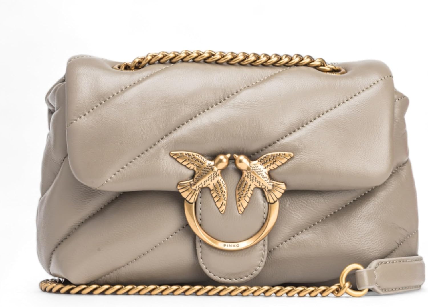 Mini Love Bag Puff in soft nappa leather with maxi oblique quilting. The pod closure is complemented by the iconic Love Birds Diamond Cut metal buckle. The interior is lined in technical fabric and includes zip fastening and wall pocket. The shoulder strap combines the classic metal chain with the practical adjustable shoulder strap.