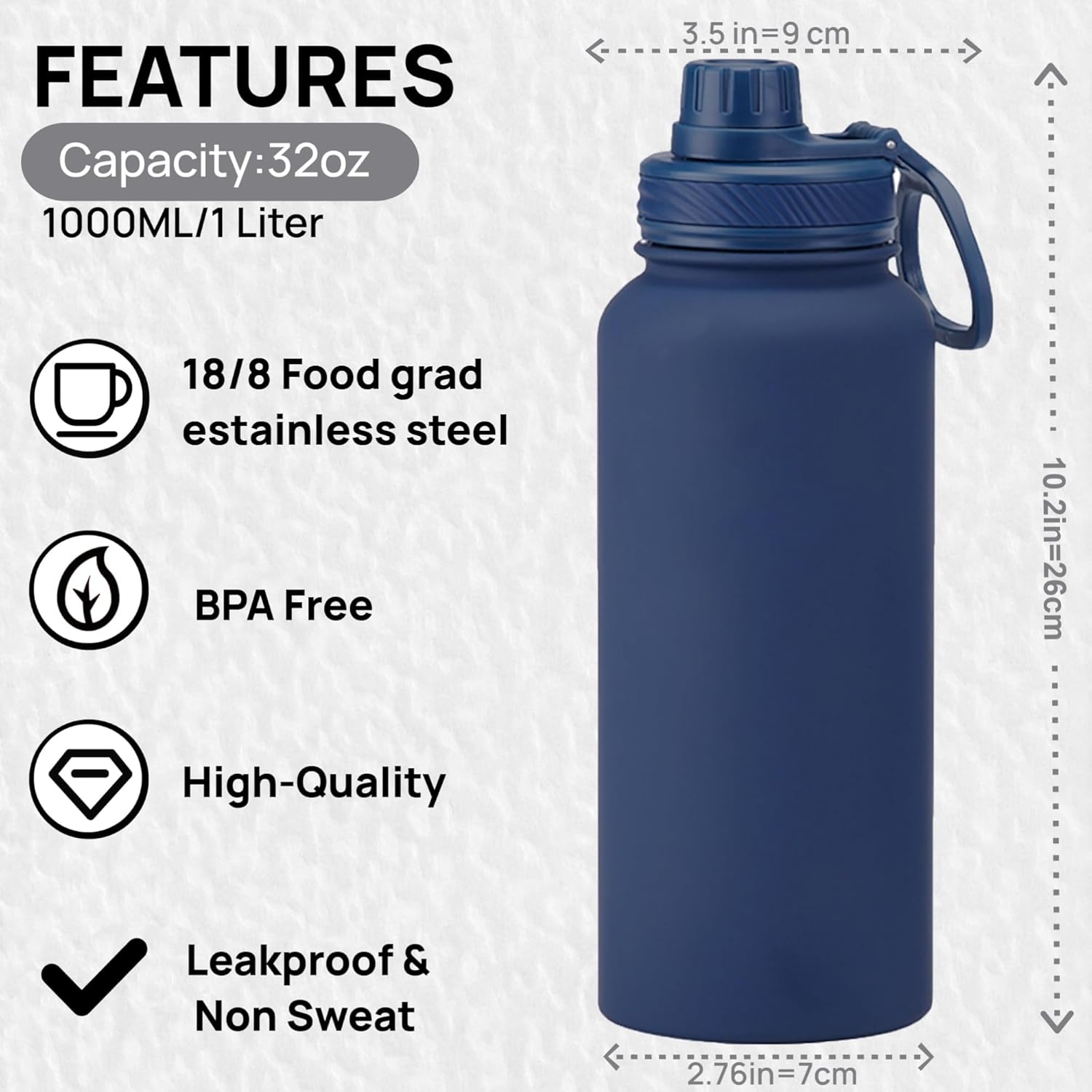 • 【High-quality Craft】: Our 1 liter water bottle made of food-grade 18/8 stainless steel which is durable.You can use it without worries.Its powder coating finish ensures a better grip, and its wide-mouth pening makes your ice filling and cleaning easy and fast.