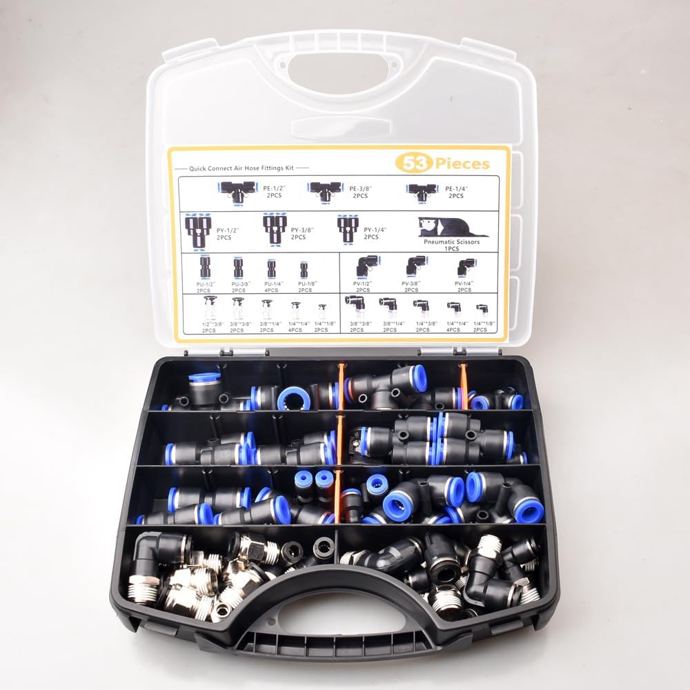 SPECIFICATION-Material: Brass, Plastic-Connection: Push-fit-Tubing O.D: 1⁄8", 1⁄4", 3⁄8", 1⁄2"-Tubing: PU / PA / PE / PVC-Tread: NPTPACKAGE12× 90° elbows8× straight unions6× tees6× 90° swivels6× splitters1× precision tubing cutterPush-Fit Design: Collar releases instantly. Once installed, the bottle cap can rotate 360 degrees. Internal locking spring grips hose when the cap is releasedUniversal Fit: Handles PU / PA / PE / PVC tubing in four OD sizes (1⁄8", 1⁄4", 3⁄8", 1⁄2"). NPT (tapered) Threads– ready for compressors, suspension, dental chairs, paint booths, lab robots, pneumatic toolsPremium Build: Nickel-plated brass and high-tensile PBT provide acid-proof, corrosion-proof, fire-resistant, age-resistant performance – built for decades of daily abuse.Complete Set: 12× 90° elbows, 8× straight unions, 6× tees, 6× 90° swivels, 6× splitters, 1× precision tubing cutterGrab-and-Go Case: Clear, compartmented box with movable dividers keeps fittings sorted, extras store flat