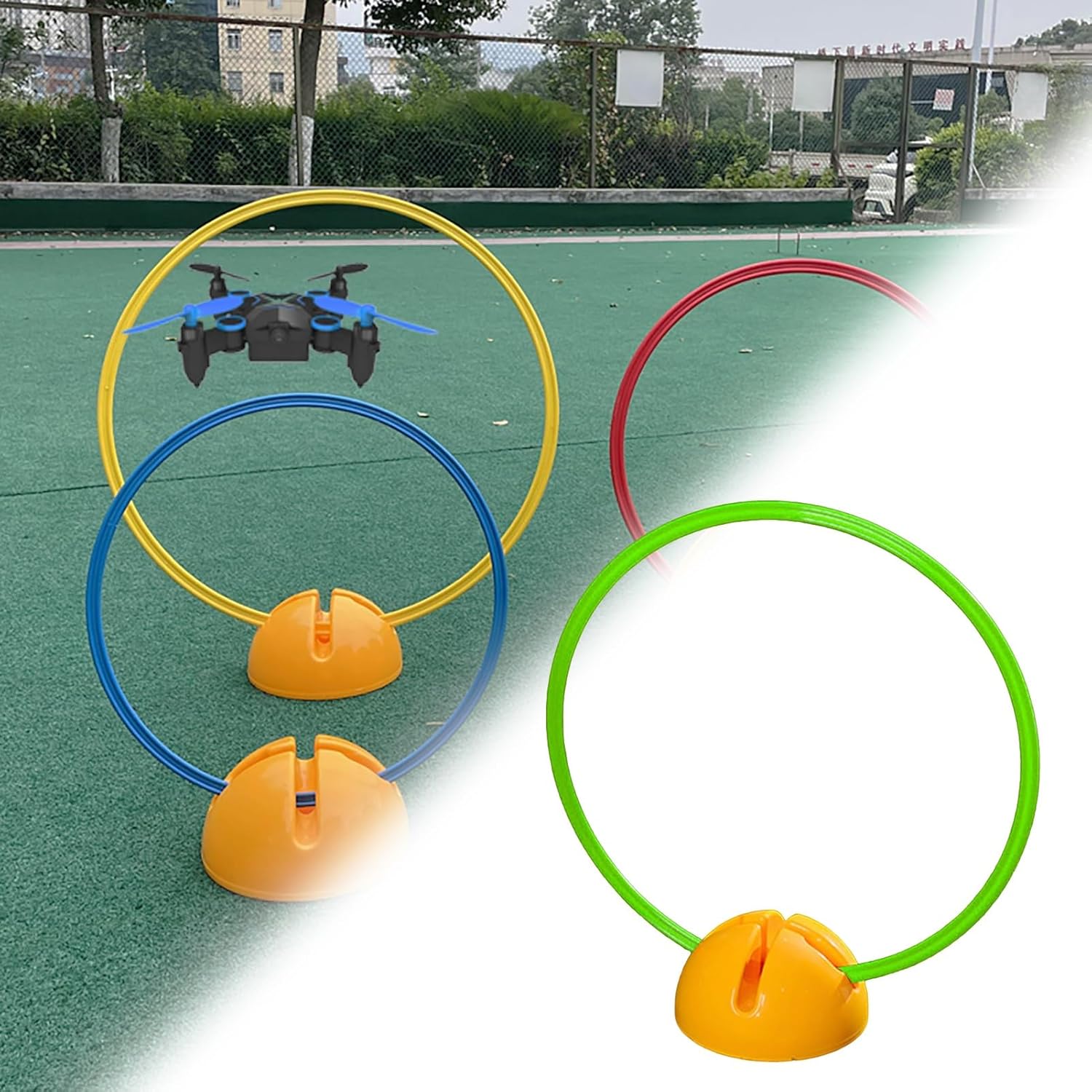 Whether you're a beginner or an experienced pilot, drone racing obstacle course kit is the perfect way to enhance your skills and experience the thrill of drone flying!Package Contents (Excluding Drone):- 1 x Obstacle Rings- 1 x Water/ Sand Fillable Base Specification:- Material: PVC Material- Available Ring Diameters:40cm(15 3/4"), 50cm(19 3/4"), 60cm(23 5/8"), 70cm(27 1/2")- Available Ring Colors:Red, Yellow, Blue, Green, Orange- Assembly Required: Yes- Base: Can be filled with water / sandFeature:- With water-fillable base, not easy to tip over.- Easy to assemble, simple and convenient to use.- Good disassembly, easy to carry and store.- You can set the race route according to your preference.- Add fun to the RC drone race.- Game loop gate set for teens, adults, amateurs.Notes:- Due to different display and different light, there may be some color difference between the picture and the product.- Due to manual measurement, there is a 0-1 cm error, specific to the actual size shall prevail.