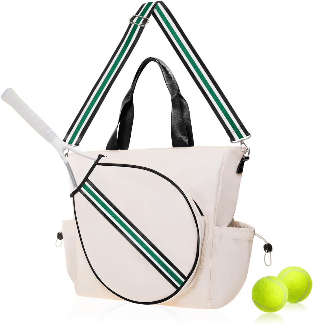 Upgrade your game with our stylish and functional Tennis Tote Bag. This versatile bag combines practicality with fashion, featuring a detachable, adjustable shoulder strap, allowing you to wear it as a tote, shoulder bag, or crossbody for multiple styling options. This chic bag provides ample storage, including a spacious main compartment with inner pockets, an exterior padded racket pouch for added protection, and two side pockets perfect for holding tennis balls and a water bottle. Accented with a vibrant color ribbon and a classic, timeless silhouette, this bag lets you showcase your unique style and personality both on and off the court.