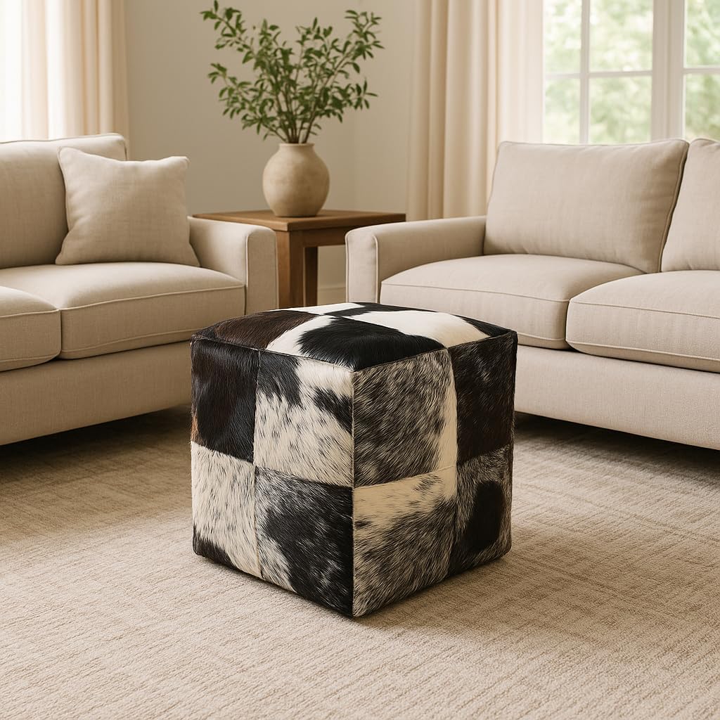 Elevate your living space with this Unstuffed Premium Hair-on Leather Ottoman Pouf, a stunning blend of rustic charm and modern design that perfectly complements any home decor style. Handcrafted with genuine cowhide, this boho-inspired square footstool showcases the natural beauty of hair-on leather, offering a unique texture and authentic look that no synthetic material can match. Measuring 18x18 inches, this versatile cube ottoman footrest is lightweight yet durable, designed to provide comfort and style in your living room, bedroom, or lounge area. Its unstuffed construction allows you to customize the filling to your desired firmness and height, making it ideal for those who value personalized comfort and flexibility. Perfect as a footrest, extra seating, or even a decorative accent, this premium ottoman pouf brings warmth and character with its natural hide patterns and hand-stitched detailing. Whether you're creating a cozy bohemian nook or adding a rustic farmhouse touch, this genuine cowhide ottoman is the perfect statement piece to complete your space with sophistication and earthy elegance.