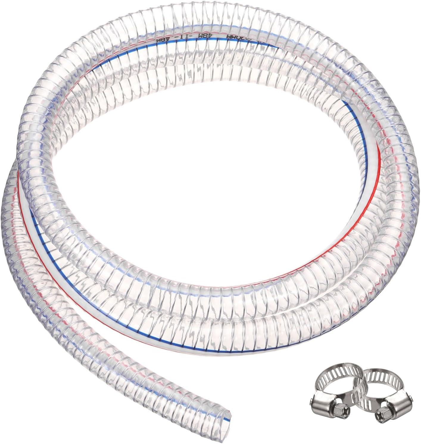 Description:Material - Made of high-strength PVC, our braided PVC pipe offers good flexibility and is resistant to kinking. It is acid-resistant, alkali-resistant, corrosion-resistant, strong, and durable, and is widely used for the suction of water, fuel, and powder.Feature - Embedded spiral steel wire is resistant to negative pressure and bending. The thickened tube wall prevents kinking. The tube is easy to unfold and roll up. The tube wall has a smooth, clear texture. The transparent tube body allows you to see the internal liquid flow.Easy to Use - The vinyl tube is easy to use; it comes with two clamps, and you can clamp the PVC pipe and machine accessories together to prevent them from slipping. The clear vinyl tube can be easily cut with any cutting tool to meet various application needs.Wide Application - PVC flexible pipes are commonly used in industry, factories, agriculture, and homes. They are suitable for the suction and discharge of agricultural water pump machinery, petrochemical equipment, industrial engineering, mining liquids, gases, oil products, and dust.Specification:Material: PVCColor: TransparentThickness: 2.5mm / 0.1"Diameter: 16 x 21mm/ 0.63" x 0.83" (ID x OD)Length: 8 m / 26 ftPackage Contents: 1 x Braided PVC Tubing; 2 x Clamps