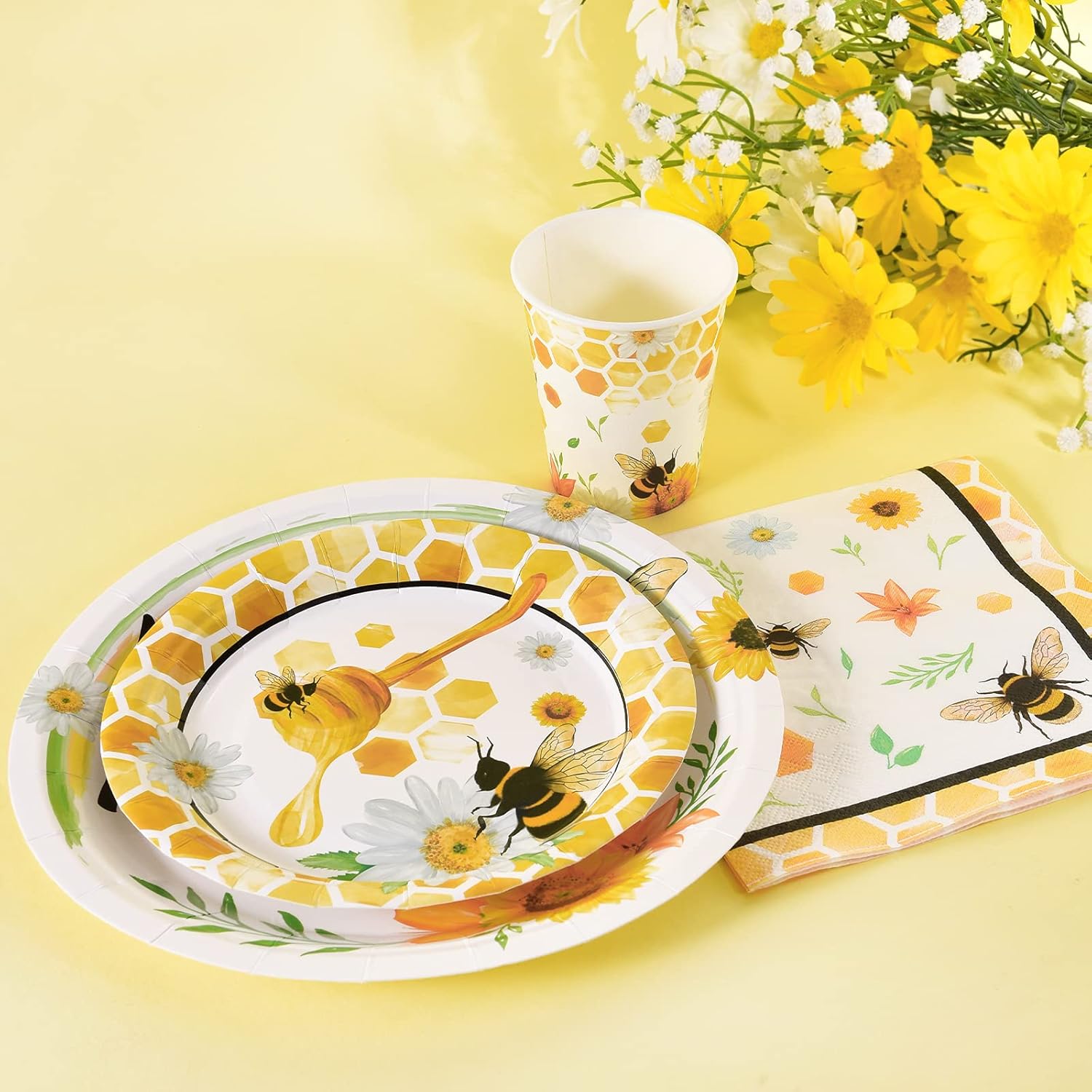 ---Features and Benefits: --You would get everything ready for a sweet bee birthday party at one time here.hope you all enjoy yourself. --Less preparation time, more time to stay with your kids to eat drink and play, Leave more precious memories at the bee birthday party. --Feel free to contact with us for any unpleasant reasons, we will reply in 24hrs. ---Package include 64 PCS: 16 x dessert plates(7"), 16 x dinner plates(9"), 16 x cups, 16 x napkins(13" x 13").