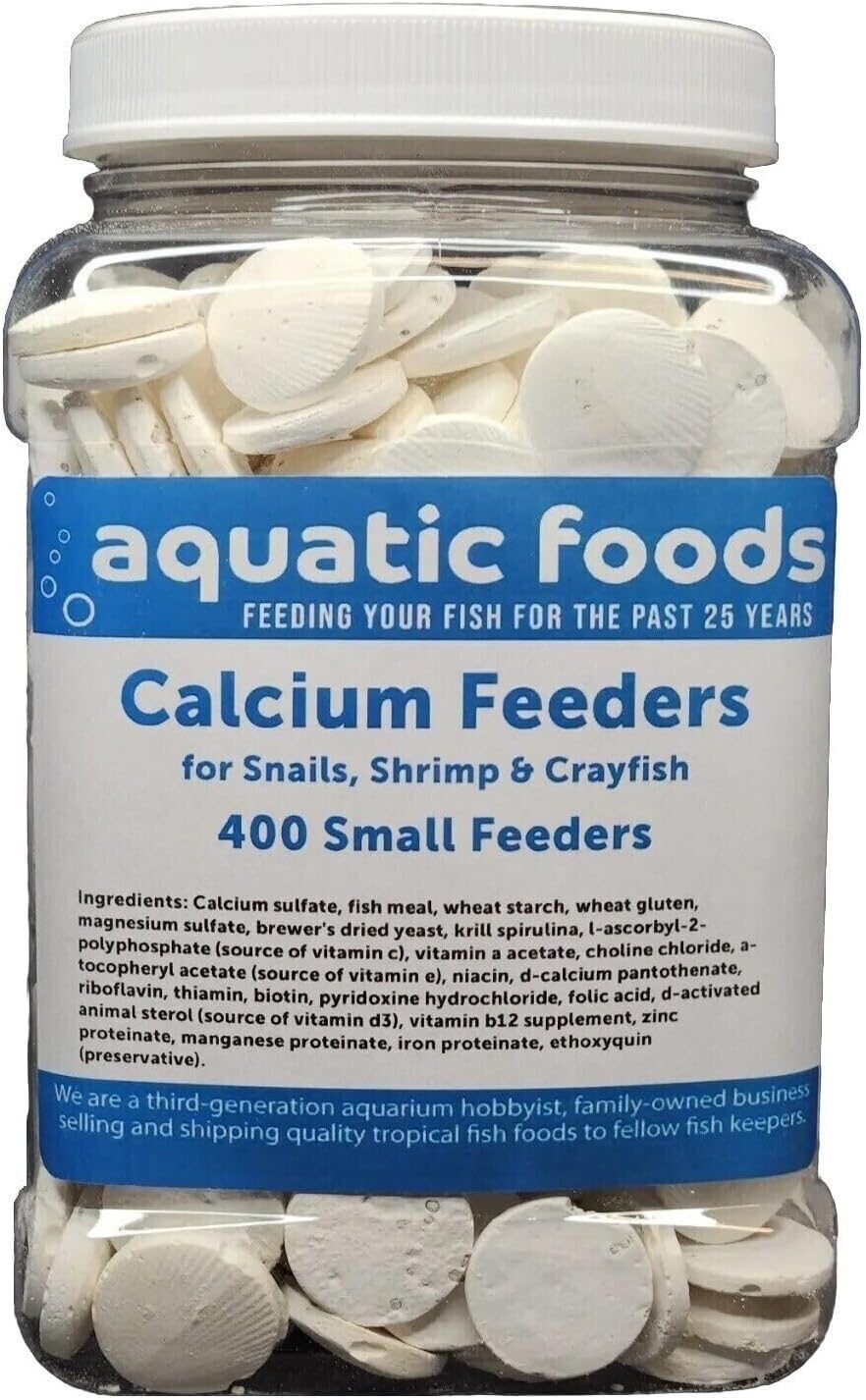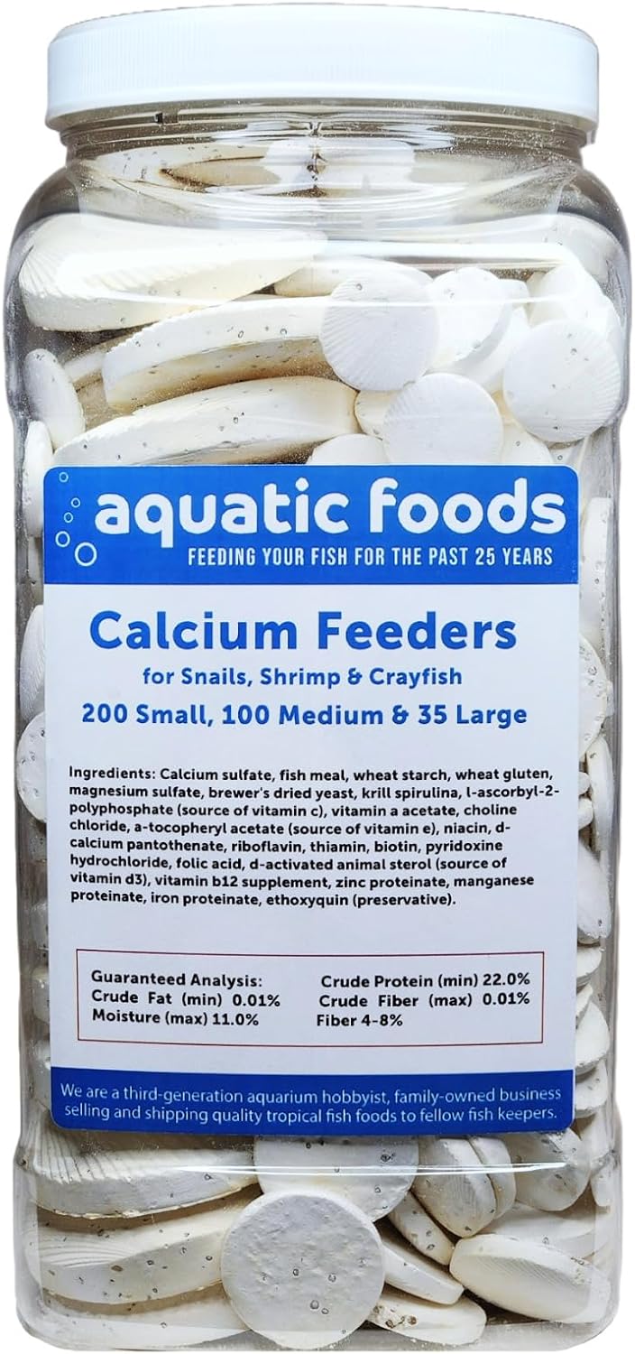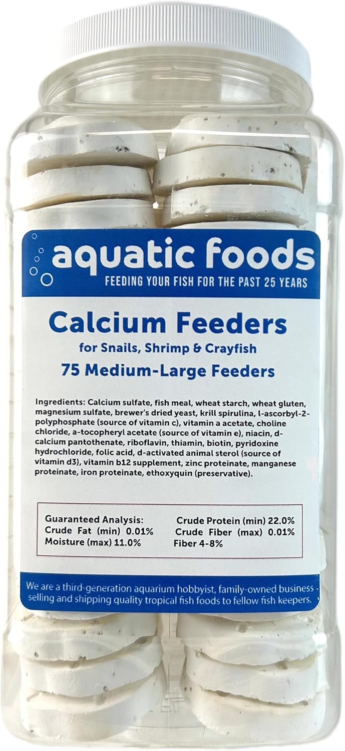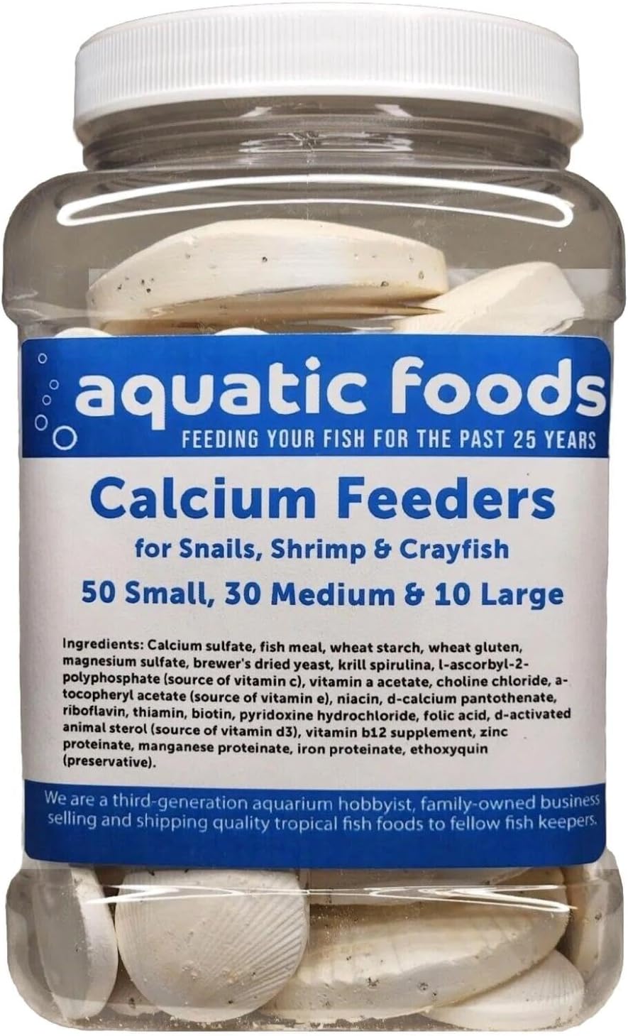 Aquatic Foods & Blackworm Co. Calcium Feeders for Shrimp, Snails, Crayfish, Crabs and TropicalsOur Calcium Feeders are sifted and graded to remove most dust and most chipsDESCRIPTIONCalcium Feeders are perfect for keeping your Shrimp, Snails, Crabs, Crayfish healthy while providing their needed Calcium. Choose from a variety of sizes and styles. Each block contains Calcium, Krill and Spirulina. Specially formulated with color enhancers to bring out the vibrant colors in your Crustaceans. Fortified with essential vitamins and minerals for overall health and longevity. Will not cloud water. Available in a variety of sizes and styles.Ingredients:Calcium sulfate, Fish Meal, Wheat starch, Wheat gluten, magnesium sulfate, Brewer's dried yeast, krill, Spirulina, l-ascorbyl-2-polyphosphate (source of vitamin c), vitamin a acetate, choline chloride, a-tocopheryl acetate (source of vitamin e), niacin, d-calcium pantothenate, riboflavin, thiamin, biotin, pyridoxine hydrochloride, folic acid, d-activated animal sterol (source of vitamin d3), vitamin b12 supplement, zinc proteinate, manganese proteinate, iron proteinate, ethoxyquin (preservative).Guaranteed Analysis:Crude Protein (min) 22.0%Crude Fat (min) 0.01%Crude Fiber (max) 0.01%Moisture (max) 11.0%